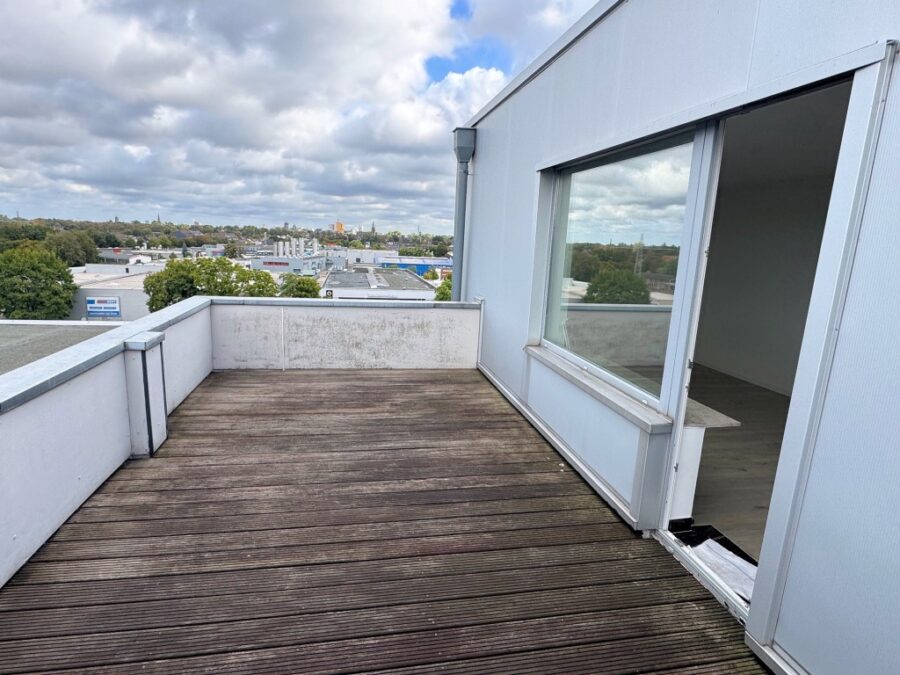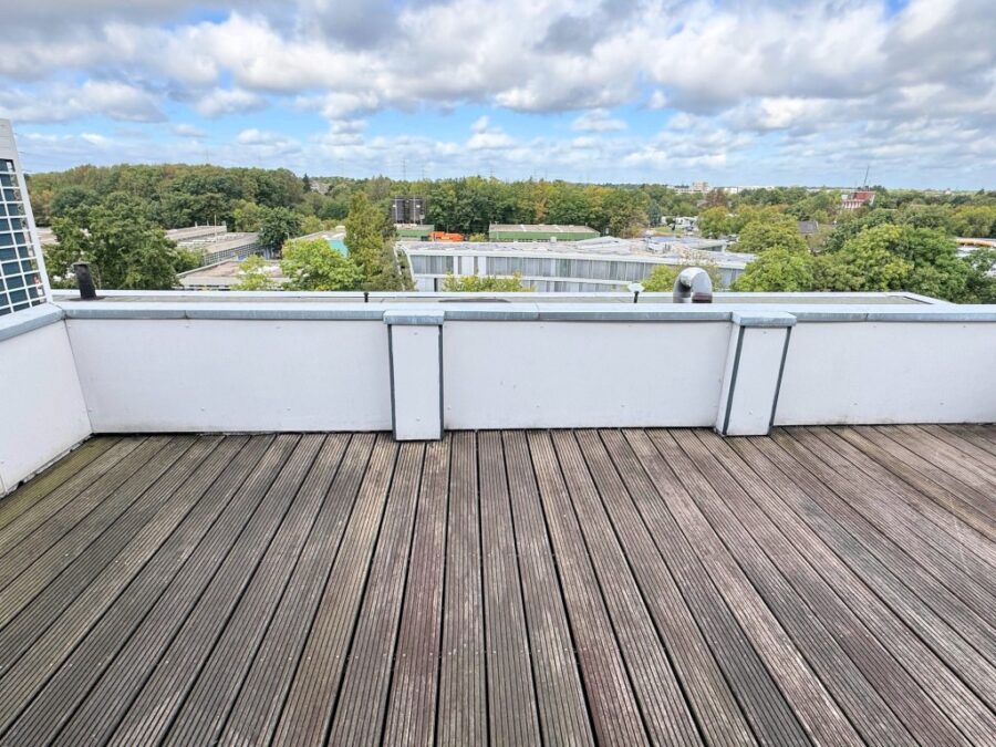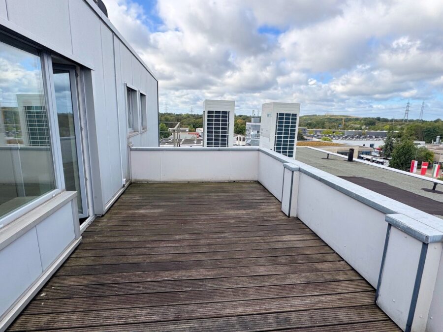 Vom Büroraum gelangt man auf eine große Dachterrasse, die nur zu dieser Büroeinheit gehört - bei solch einem "Freizeitangebot" wird die Arbeit beinahe zur Last!