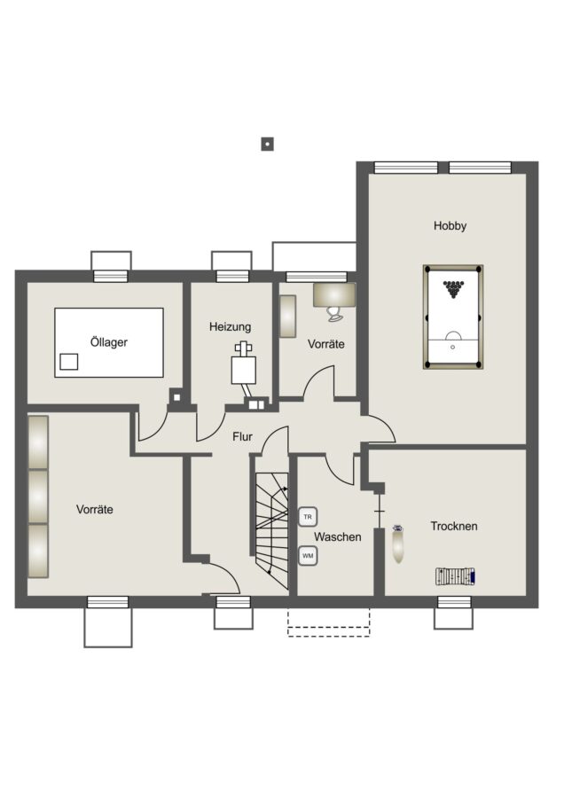 Das Kellergeschoss bietet zusätzlichen Raum und vielfältige Nutzungsmöglichkeiten. Neben einer Diele stehen Ihnen hier ein Heizungsraum, zwei Vorratsräume, ein Waschraum, ein Trockenraum sowie ein geräumiger Hobbyraum zur Verfügung.