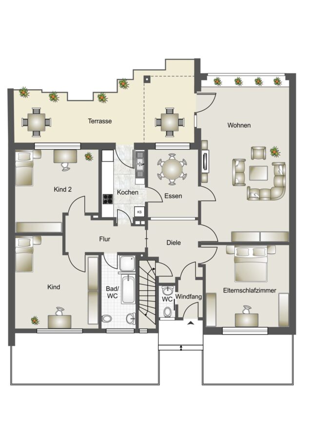 Im Erdgeschoss erwartet Sie eine durchdachte Raumaufteilung: Von der Diele aus erreichen Sie ein Gäste-WC, ein Tageslichtbad mit Wanne und Dusche, ein Elternschlafzimmer, zwei Kinderzimmer, eine separate Küche, ein Esszimmer sowie ein großzügiges Wohnzimmer mit Zugang zur sonnigen Terrasse.