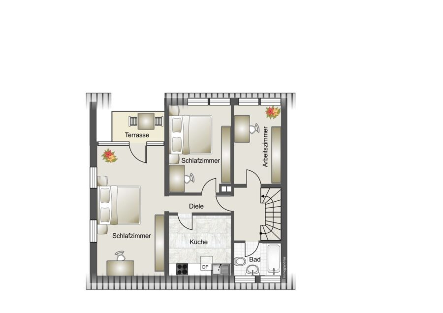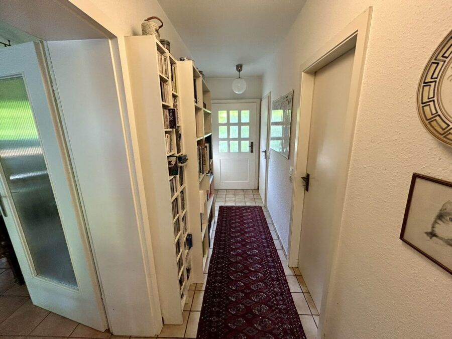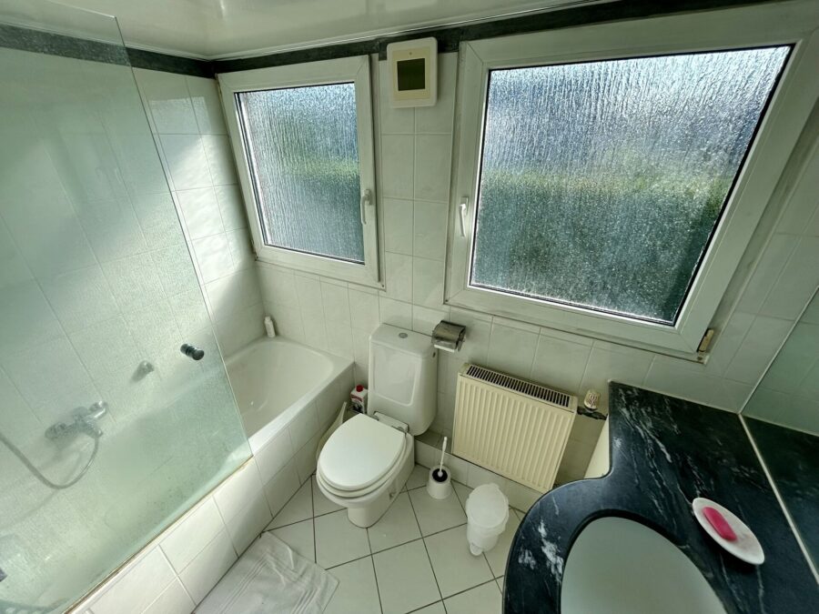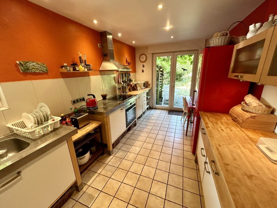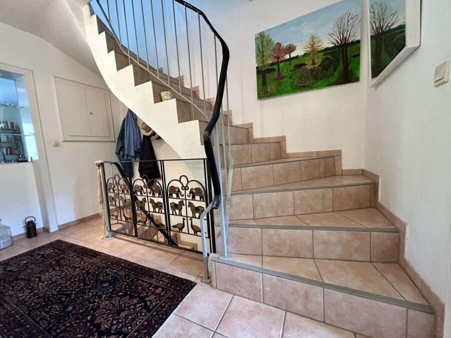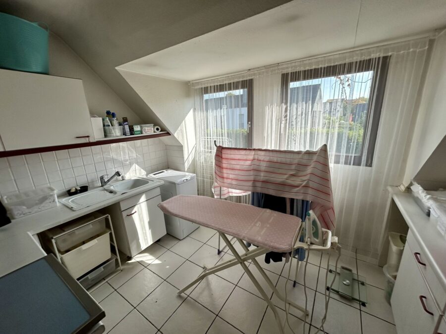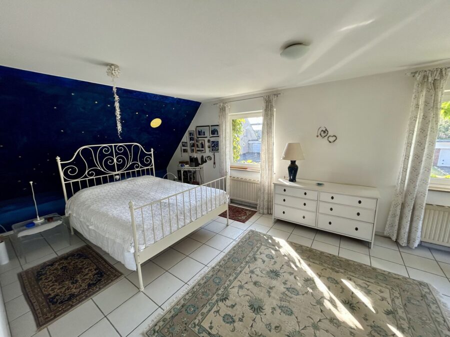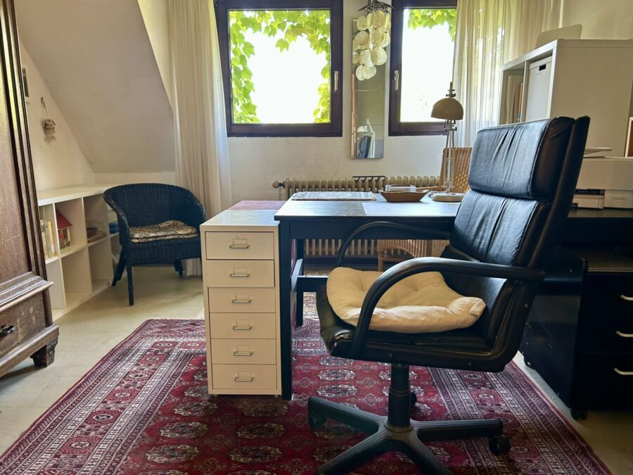 Das Obergeschoss umfasst eine Diele, zwei Schlafzimmer – eines davon mit Zugang zum Balkon –, ein Arbeitszimmer, ein Wannenbad mit Fenster sowie eine weitere Küche, die alternativ als Hauswirtschaftsraum oder Büro genutzt werden kann.