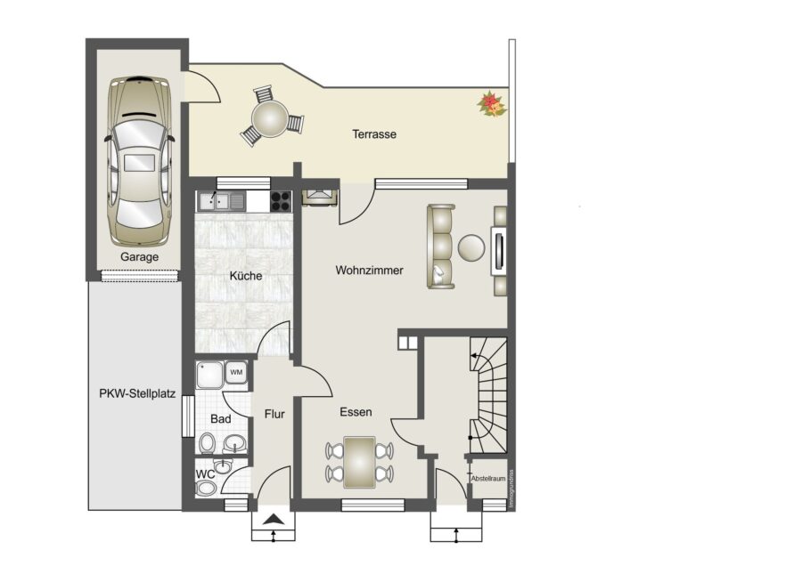 Im Erdgeschoss erwarten Sie zwei Dielen, ein großzügiges Wohn- und Esszimmer mit Zugang zur Terrasse, ein Gäste-WCs, einen Abstellrau, ein Duschbad mit Fenster sowie eine Küche.