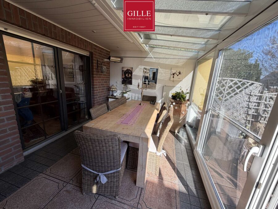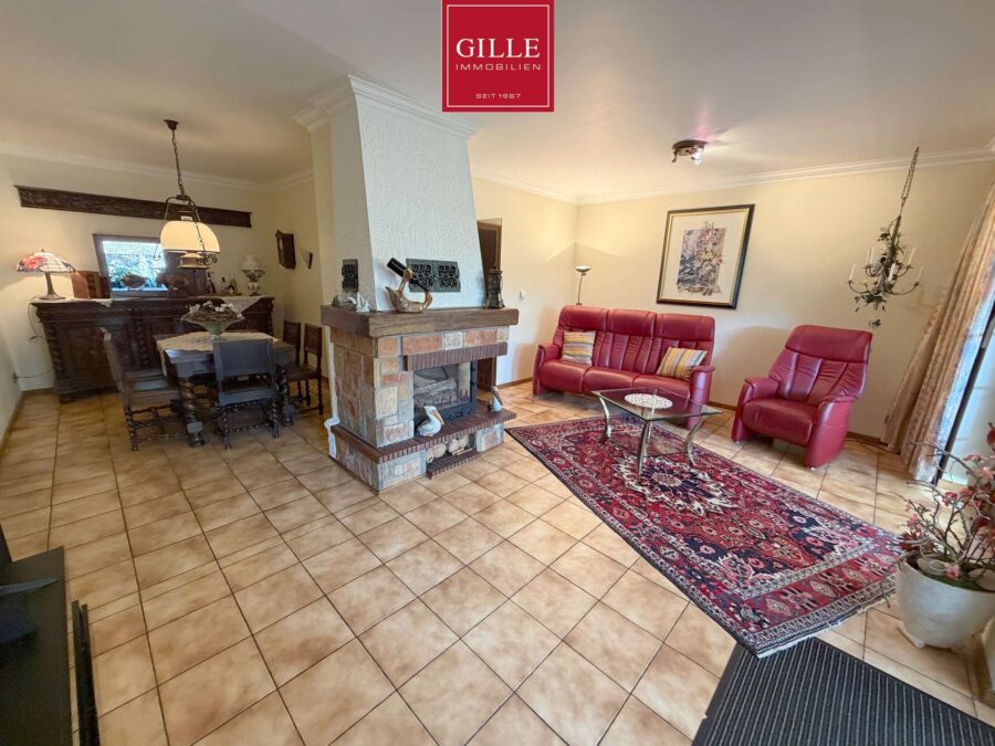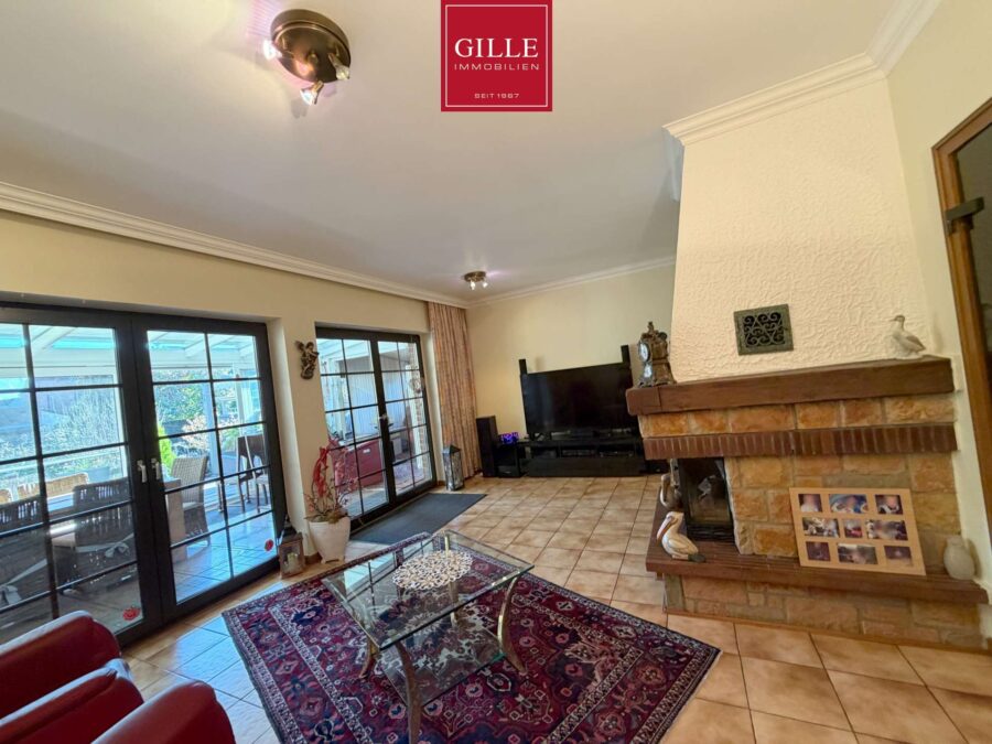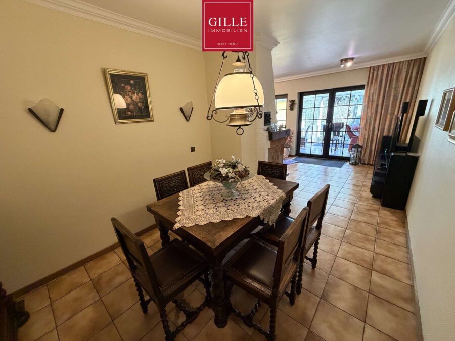 Die großzügige Eingangsdiele wurde hell gestaltet, mit einem unempfindlichen Fliesenboden versehen und verbindet alle Räume im Erdgeschoss. Von der Diele aus erreichen Sie das teilmodernisierte Gäste-WC mit neuem WC-Block, Waschbecken und Fenster sowie die große Küche mit großem Fenster und Durchreiche zum Essplatz. In der Diele fällt die massive Eichentreppe vom Keller bis ins Dachgeschoss ins Auge. Der Wohn-Essbereich gliedert sich in einen Essplatz mit Durchreiche zur Küche und einen Wohnbereich mit Kamin und großer Fensterfront zum Wintergarten bzw. Garten. Der großzügige Wintergarten bietet nochmals einen attraktiven Essplatz mit schönem Blick auf den vorgelagerten Fischteich und in den Terrassenbereich. Auf der gegenüber liegenden Seite des Essplatzes haben die Eigentümer eine gemütliche TV-Ecke eingerichtet. Von hier aus besteht auch ein Zugang zur Garage und zum Keller. Der Wintergarten ist beheizt und verfügt über eine Klimaanlage für den Hochsommer. Zusätzlich steht eine aufwändige Beschattungsanlage zur Verfügung. Der gesamte Erdgeschossbereich einschließlich Wintergarten wurde mit Fliesen ausgelegt.