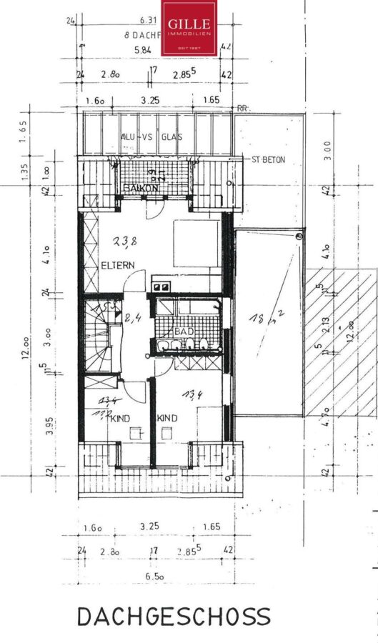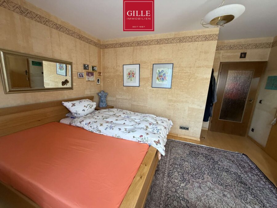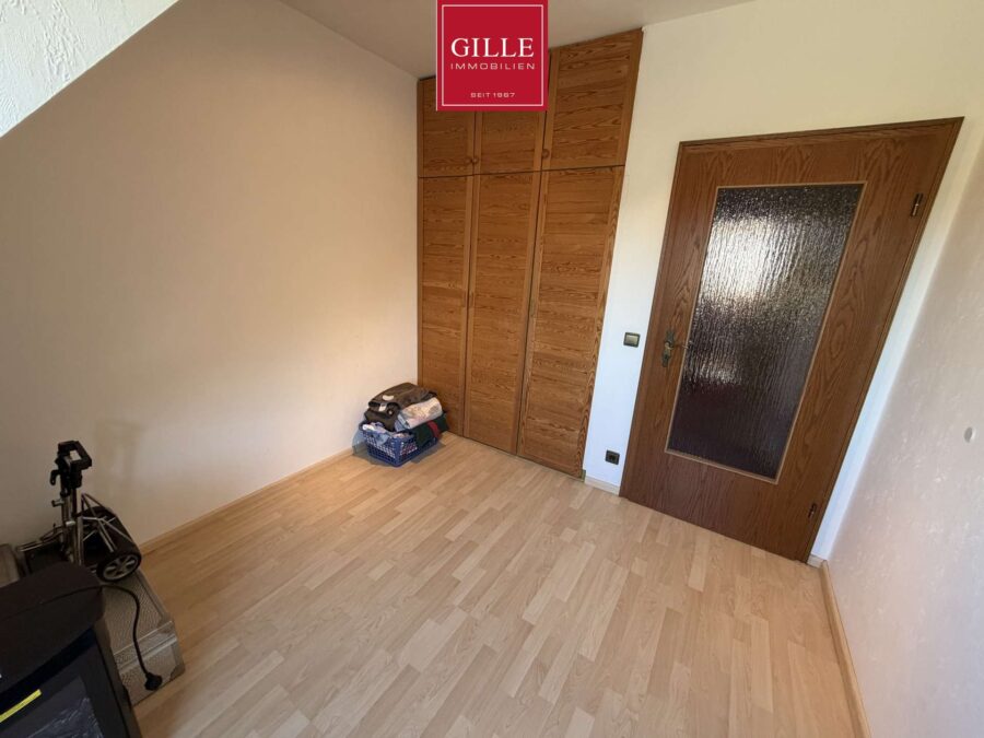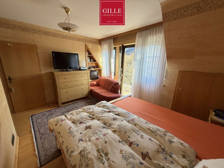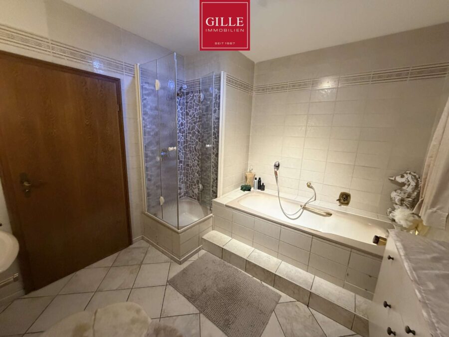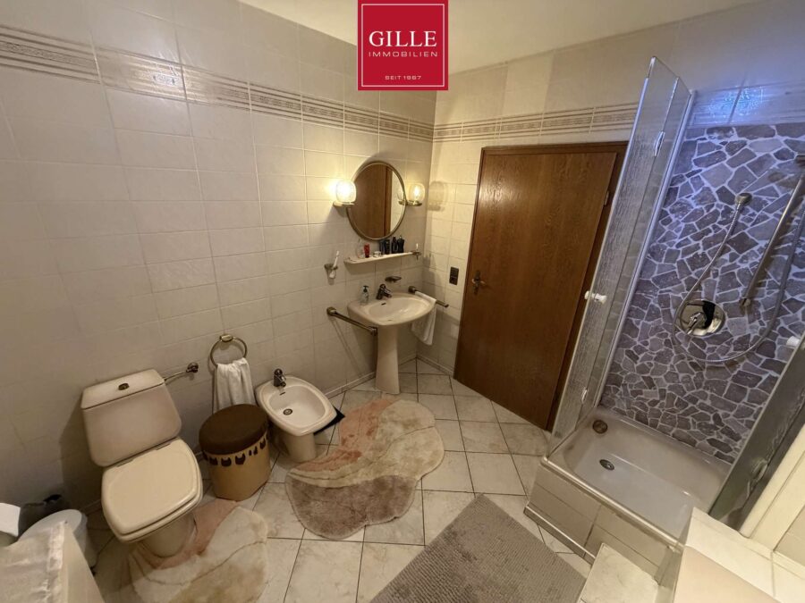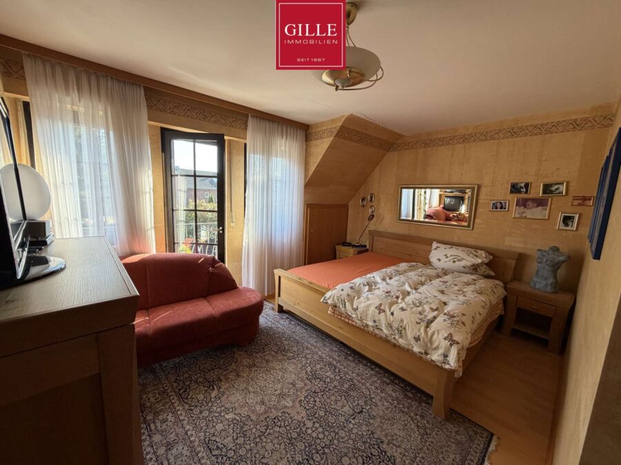 Über die großzügige Eichentreppe gelangen Sie in das 1. Obergeschoss. Hier finden Sie neben einem großen Elternschlafzimmer mit Parkettboden, Ausgang zum Balkon und einer separaten Ankleide auch ein sehr großes Badezimmer. Dieses Badezimmer verfügt neben einem Fenster über einen Waschtisch, WC und Bidet. Zusätzlich wurde eine Badewanne eingebaut, eine große Dusche mit Mosaikwand und Glasabtrennung eingerichtet und der Fußboden mit marmorierten Fliesen auf Fußbodenheizung versehen. Das Badezimmer macht einen sehr gepflegten Eindruck. Zusätzlich liegen auf dieser Etage zwei Kinderzimmer, von denen eines derzeit als Büro genutzt wird und mit Teppichboden ausgelegt wurde. Dieses Zimmer verfügt neben einer Dachgaube auch über ein schönes Giebelfenster. Das zweite Kinderzimmer verfügt über ein großes Gaubenfenster und einen Einbauschrank. Der Fußbodenbelag wurde hier in Laminat gewählt.