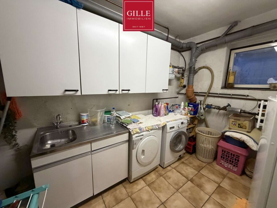 Neben diesem Raum liegt der Hauswirtschaftsraum mit Waschmaschinenanschlüssen und Vorratsmöglichkeiten. Auch dieser Raum wurde gefliest und verfügt über ein Fenster.