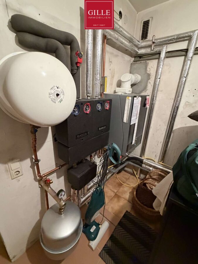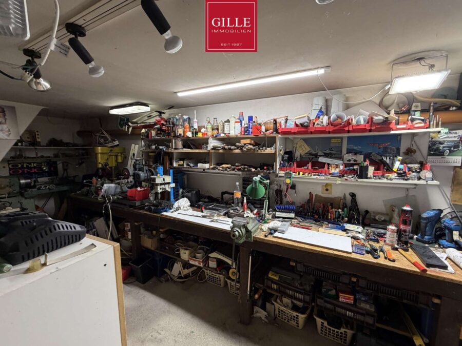 Der Heizungsraum wurde ebenfalls hell gestaltet und beherbergt die neue Heizungsanlage mit Warmwasserspeicher aus 2019. Durch diesen Raum gelangt man in den unterkellerten Teil der Garage. Hier hat der Eigentümer seine Werkstatt eingerichtet.