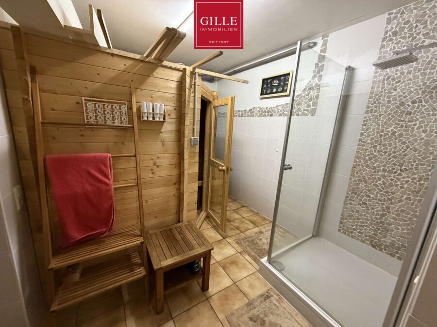 Der Kellerbereich verfügt über eine hohe Deckenhöhe und wurde größtenteils ausgebaut. Von der Kellerdiele aus gelangen Sie in den Saunaraum mit Sauna, Dusche und Fenster. Dieser Raum ist beheizt und sehr ansprechend gestaltet.
