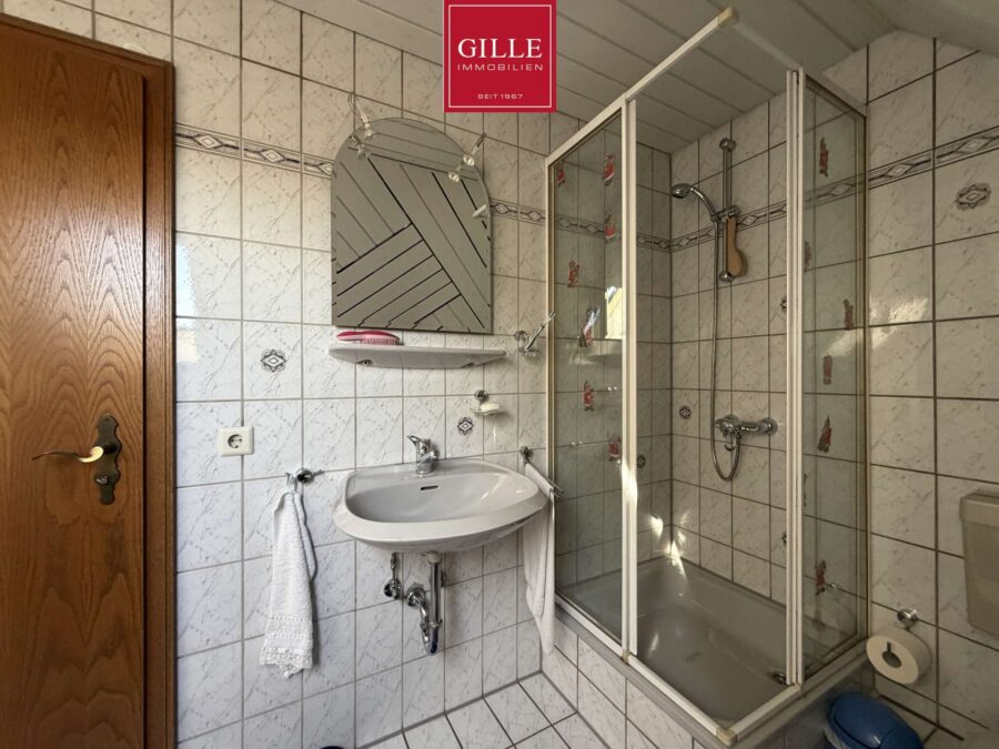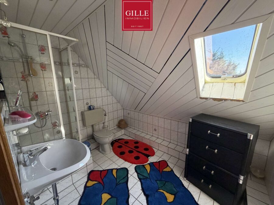 Das Dachstudio wurde beim Bau bereits mit ausgebaut und verfügt über eine Baugenehmigung. Hier wurde ein abgeschlossener Bereich für ältere Kinder, Gäste oder auch als Homeoffice angelegt. Das Studio verfügt über ein sehr großes Giebelfenster, eine große Deckenhöhe bis in die Dachspitze und über ein eigenes Duschbad. Das Duschbad bietet eine Dusche, ein WC und ein Waschbecken. Belüftet wird dieses Bad über ein Dachfenster und es wurde hell marmoriert gefliest. Hier hat man als Jugendlicher sein eigenes kleines Reich.