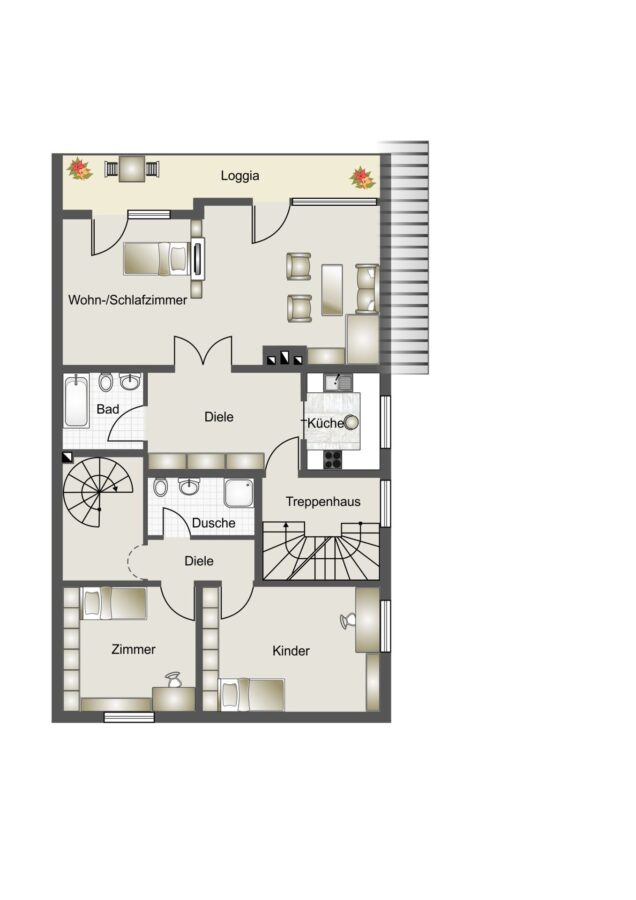 Die als Maisonettewohnung konzipierte Hauptwohnung mit 129 m² bietet Ihnen eine Diele, von dieser erreichen Sie sämtliche Räume, ein großzügiges Wohn- und Esszimmer mit Zugang zur Terrasse, ein Badezimmer, eine Küche sowie zwei Schlafzimmer. Über eine repräsentative in der Diele liegende Treppe gelangen Sie in das Obergeschoss. Hier befinden sich eine Diele, ein Badezimmer sowie zwei weitere Schlafzimmer.
