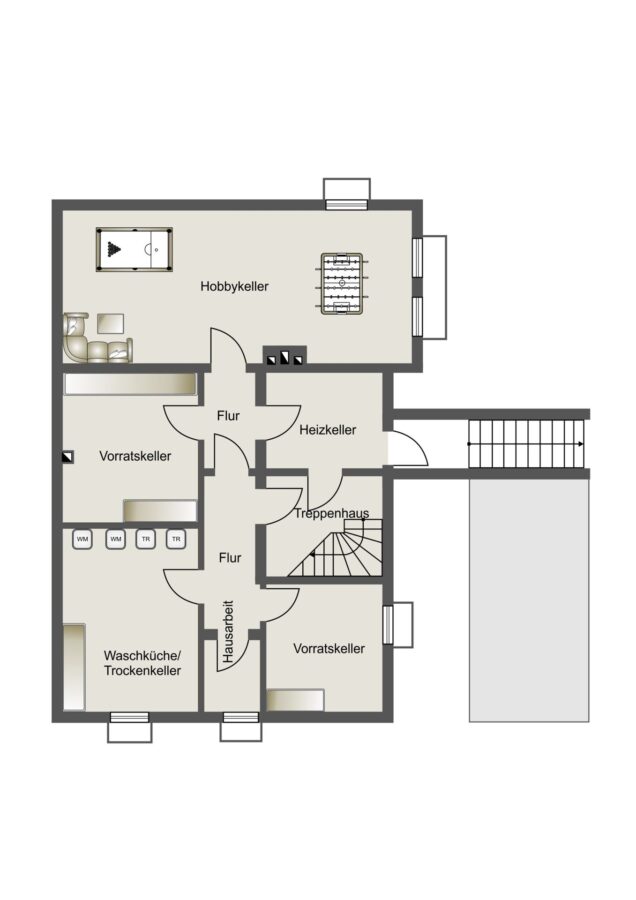 Im Keller stehen Ihnen ein großer Hobbyraum, zwei Vorratsräume, ein Heizungsraum sowie ein Wasch- und Trockenraum zur Verfügung.