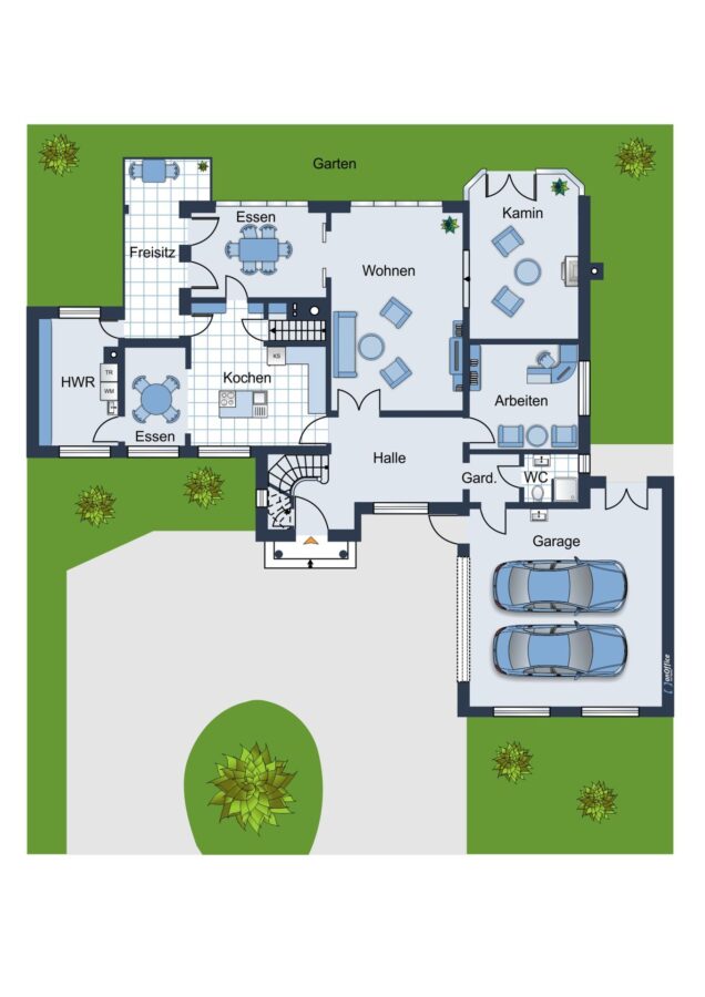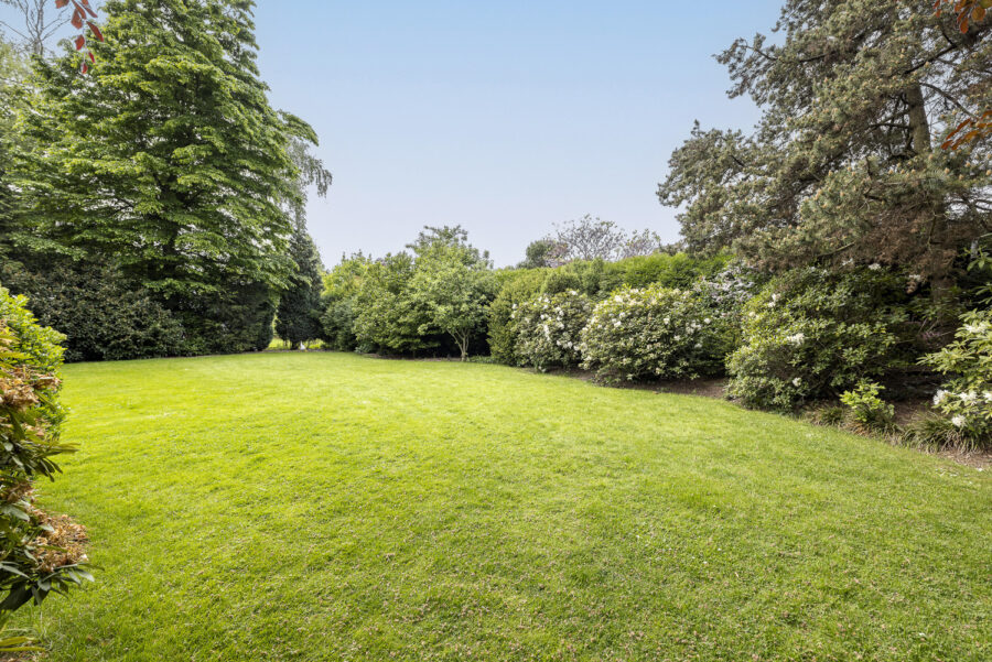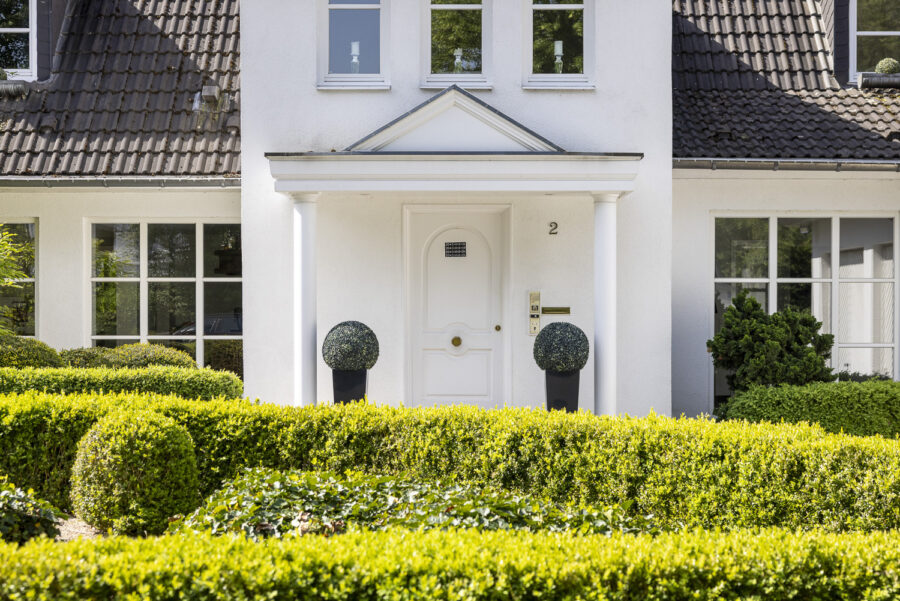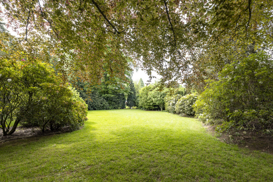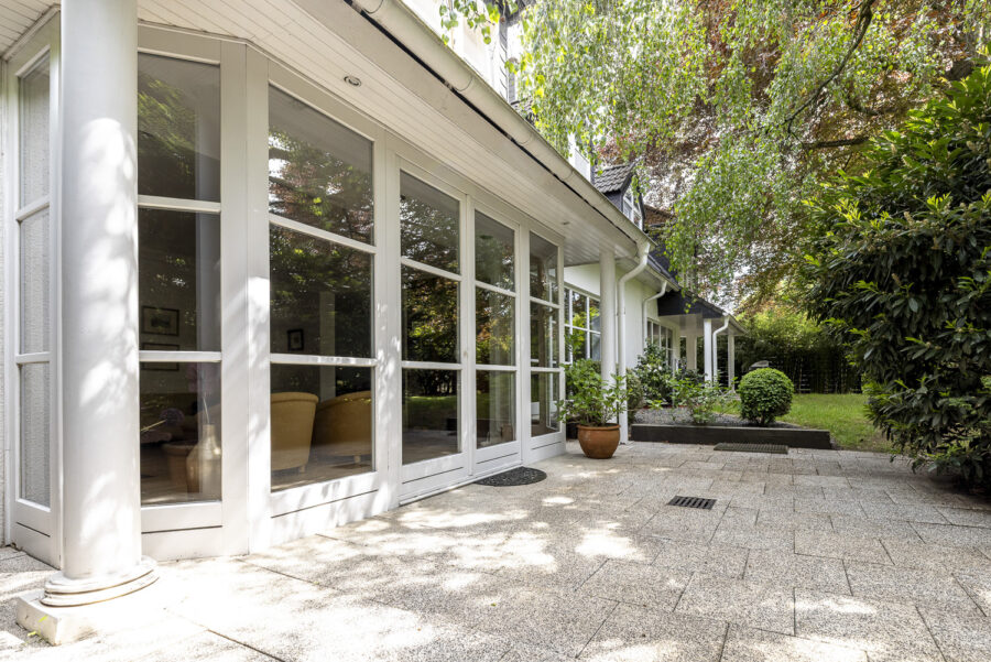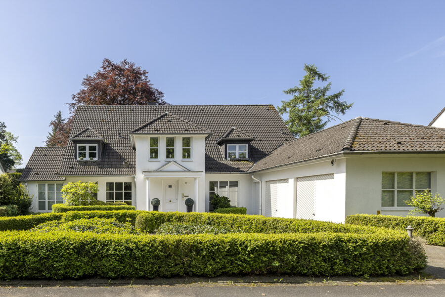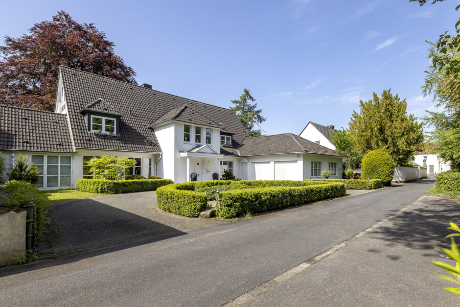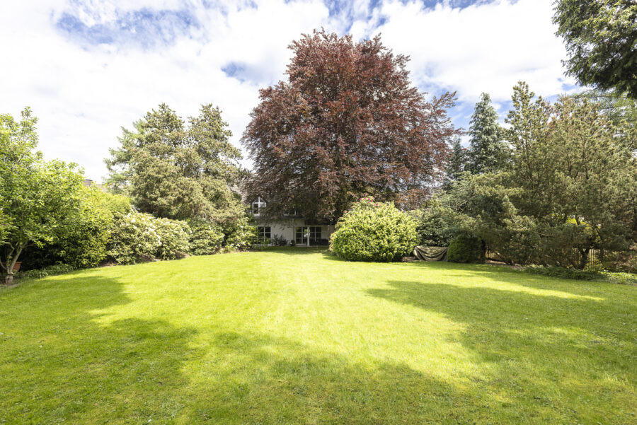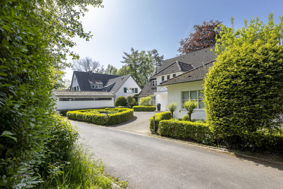 Das Grundstück besticht durch einen gepflegten Garten mit altem Baumbestand und mehreren Terrassen. Die eingefriedete Lage in Kombination mit der dichten Begrünung sorgt dafür, dass der Garten nicht einsehbar ist und ein ruhiges Wohnen in geschützter Atmosphäre ermöglicht. Eine großzügige Einfahrt mit mehreren Stellplätzen führt zum Eingang des Hauses, neben dem sich eine große Doppelgarage befindet, über die man ebenfalls einen direkten Zugang zum Haus hat.