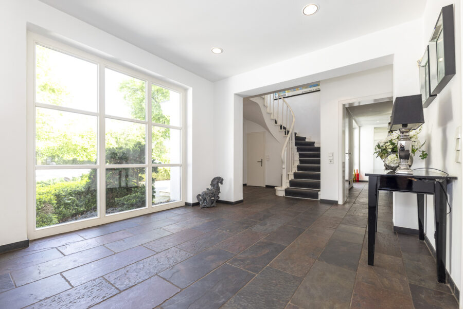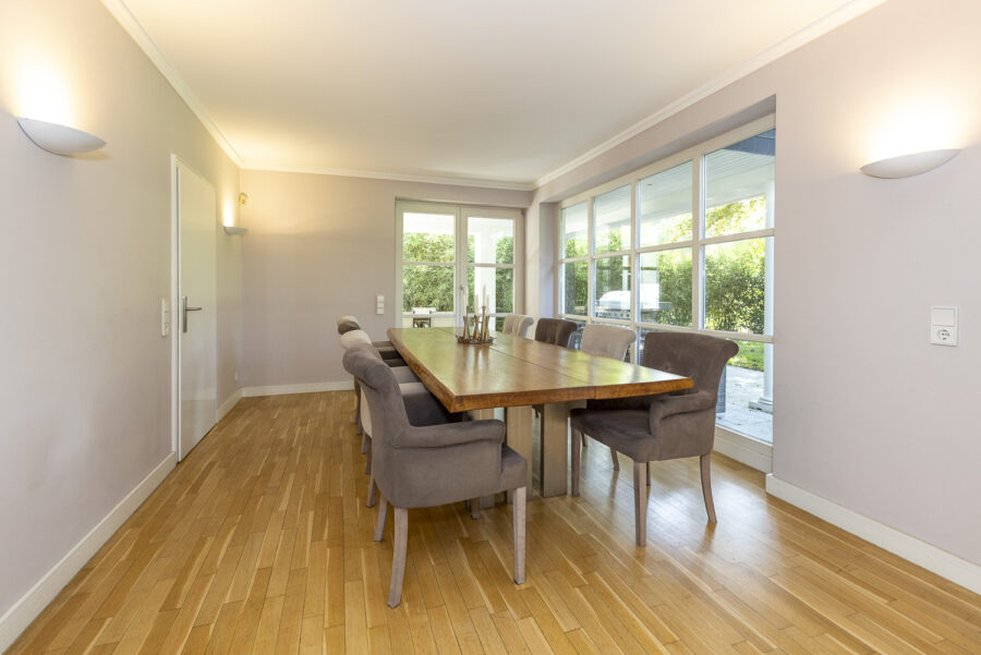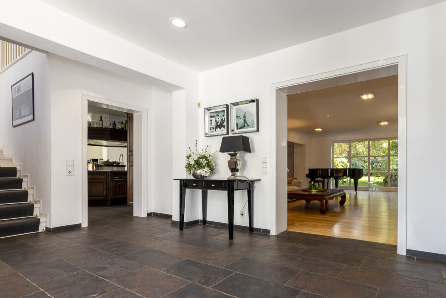 Im Erdgeschoss erschließt eine helle Eingangshalle alle wesentlichen Bereiche des Hauses: eine große Küche mit Essplatz und einem angrenzendem Hauswirtschaftsraum, Esszimmer, Wohn- und Kaminzimmer sowie ein Arbeits- oder Gästezimmer mit eigenem Duschbad. Aus sämtlichen Aufenthaltsräumen dieser Ebene besteht ein direkter Zugang zum Garten.