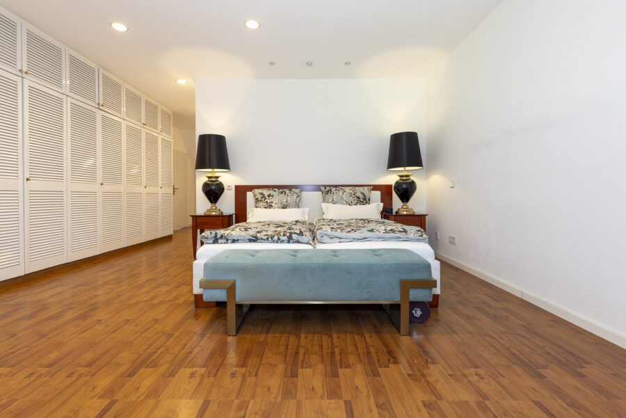 Das Obergeschoss ist über eine elegante, geschwungene Treppe erreichbar. Über einen großzügigen Flur erreichen Sie die 4 Schlafzimmer und 3 Bäder. Das Elternschlafzimmer ist komplett ausgestattet mit Einbauschränken und einem Bad en Suite, 2 anschließende Kinderzimmer mit einem gemeinsam zu nutzendem Duschbad sowie ein weiteres Schlafzimmer mit eigenem Duschbad. Alle Zimmer im Obergeschoss liegen auf der Gartenseite.