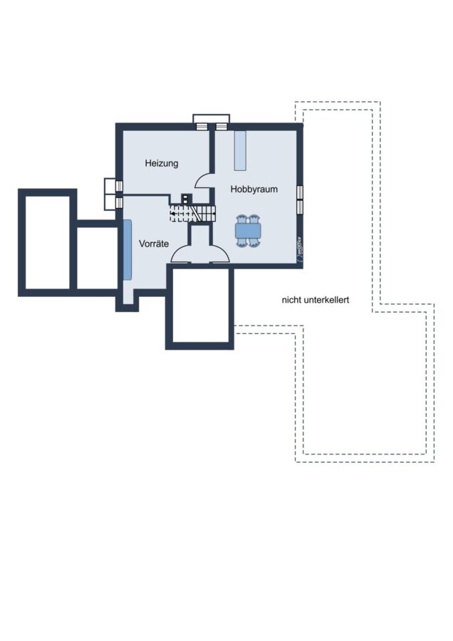 Das Haus ist teilunterkellert und verfügt über einen Flur, einen Vorrats- und Heizungskeller sowie einen Partykeller.