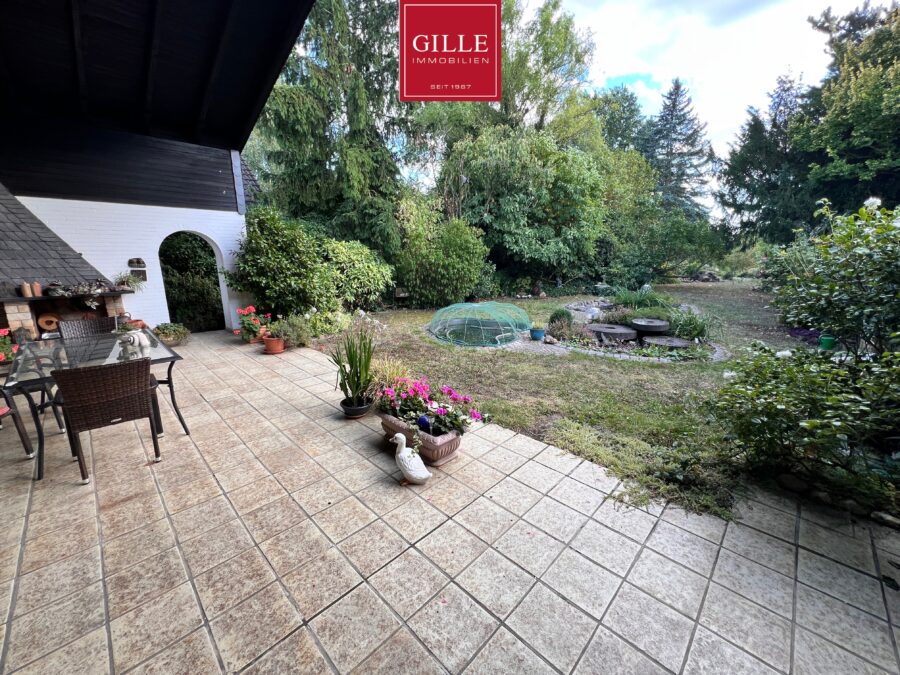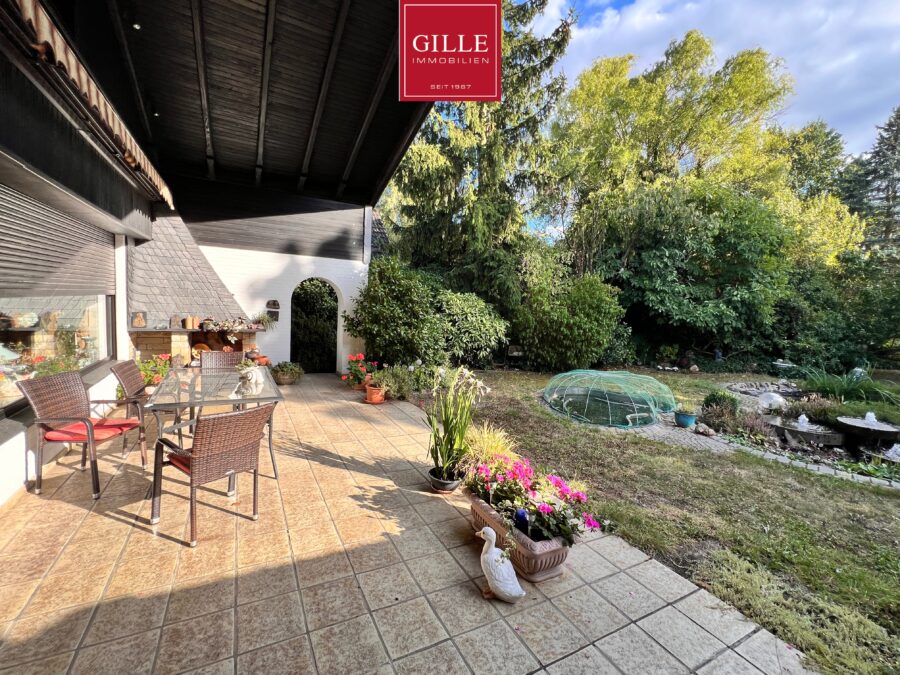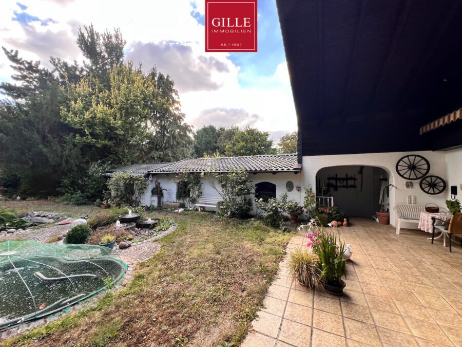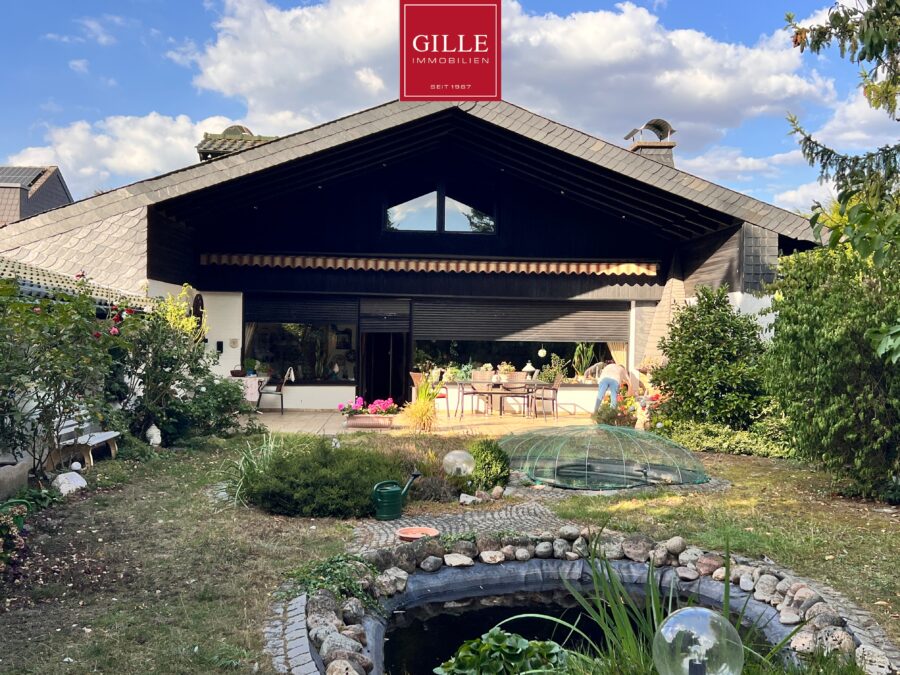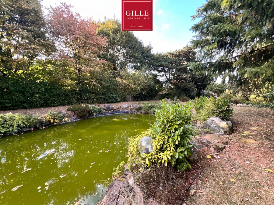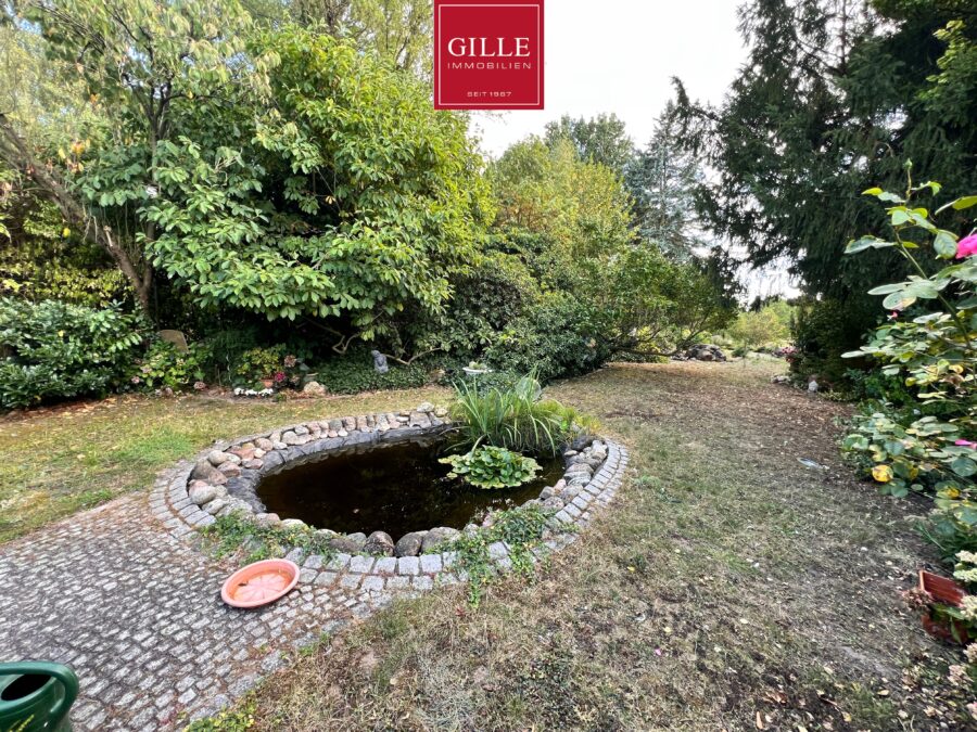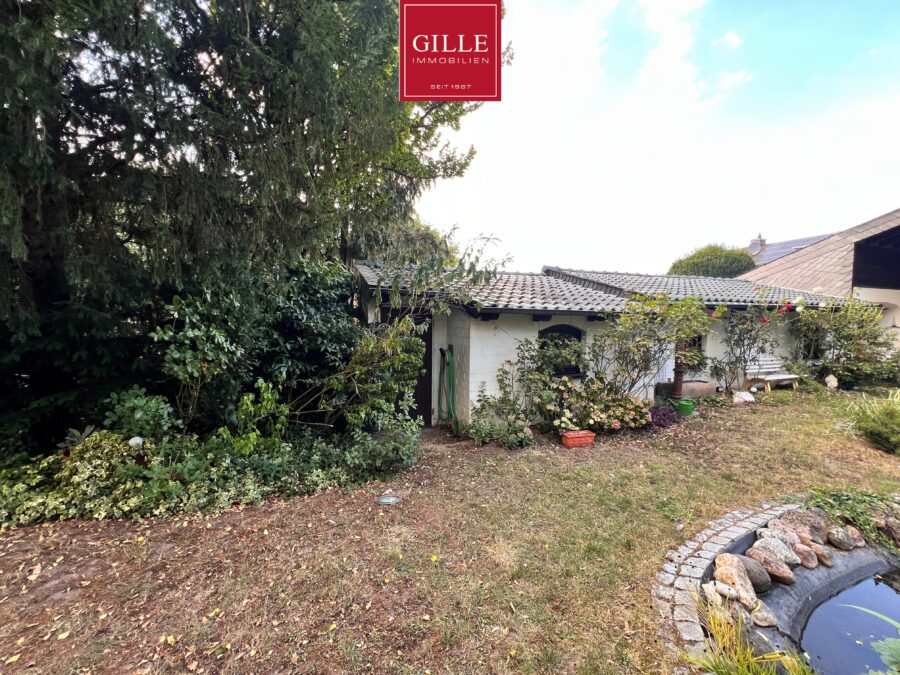 Zwei Garagen, ein sehr großer Wohnmobil-Carport und ein Werkstatt-Gartenhaus sowie der Garten mit Teichanlage und freiem Blick komplettieren das Angebot.