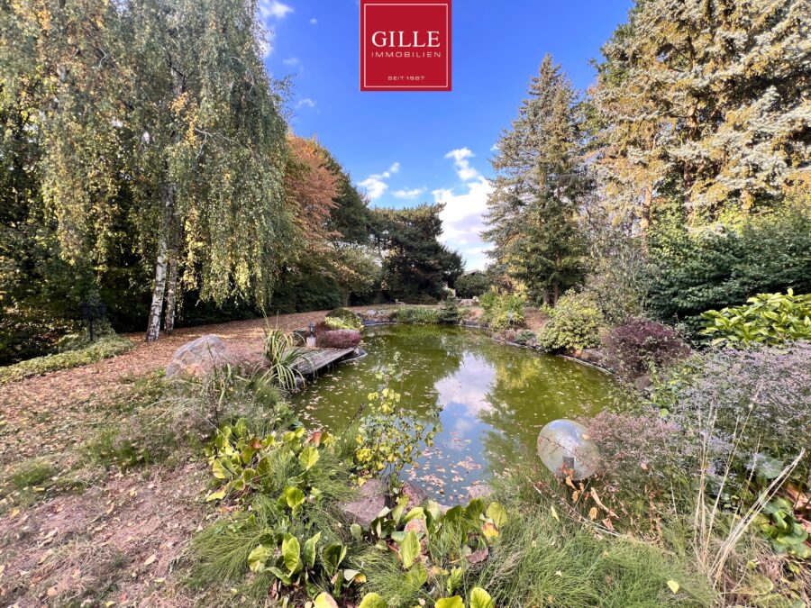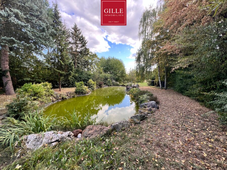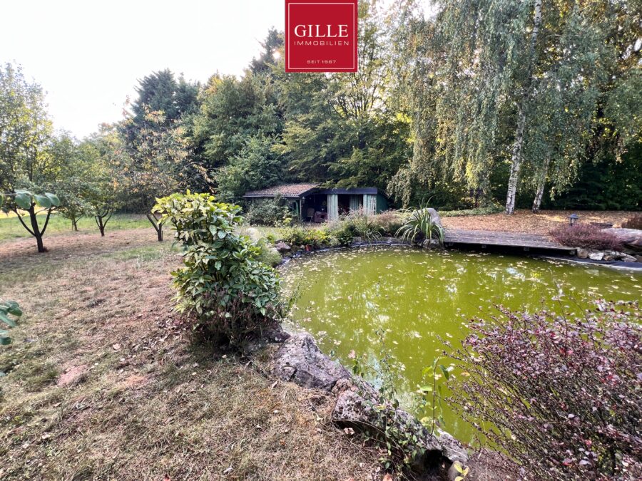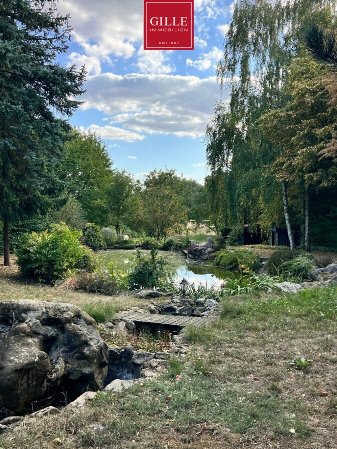 Der Garten wurde sehr großzügig und liebevoll gestaltet. Hier finden Sie neben Obstbäumen, verschiedenen Teichanlagen einen weiten Blick in die umliegenden Felder. Im Gartenbereich finden Sie ein Gartenhaus mit Werkstatt.