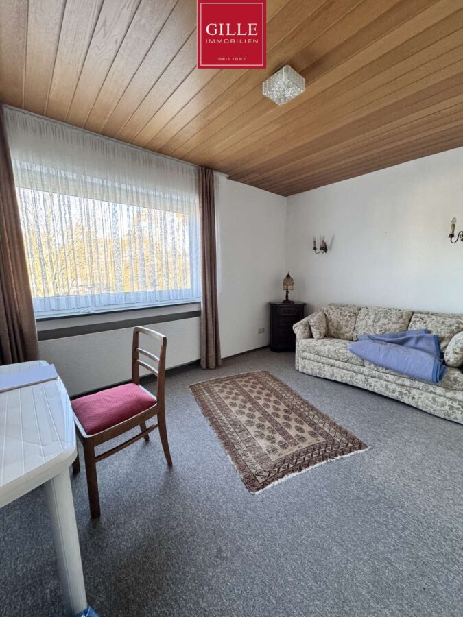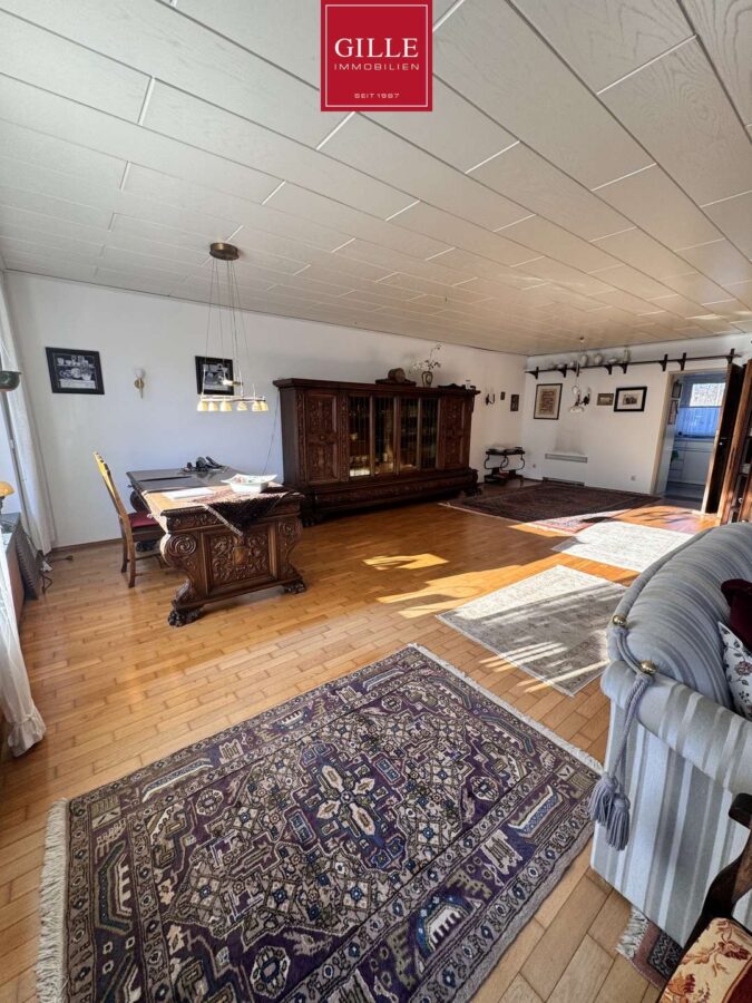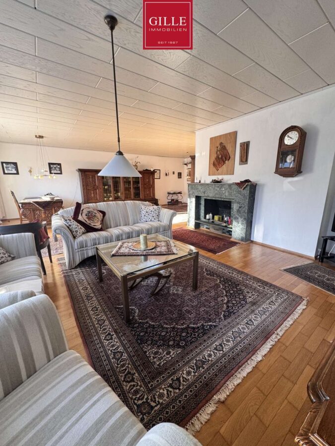 Mittelpunkt des Hauses ist das rund 52 Quadratmeter große, L-förmig geschnittene Wohnzimmer, das dank der großen Fensterflächen besonders hell wirkt und einen direkten Zugang in den weitläufigen, liebevoll gepflegten Garten bietet. Hier entsteht ein fließender Übergang zwischen Wohnen und Natur, ideal für entspannte Stunden, Familienleben oder gesellige Abende.