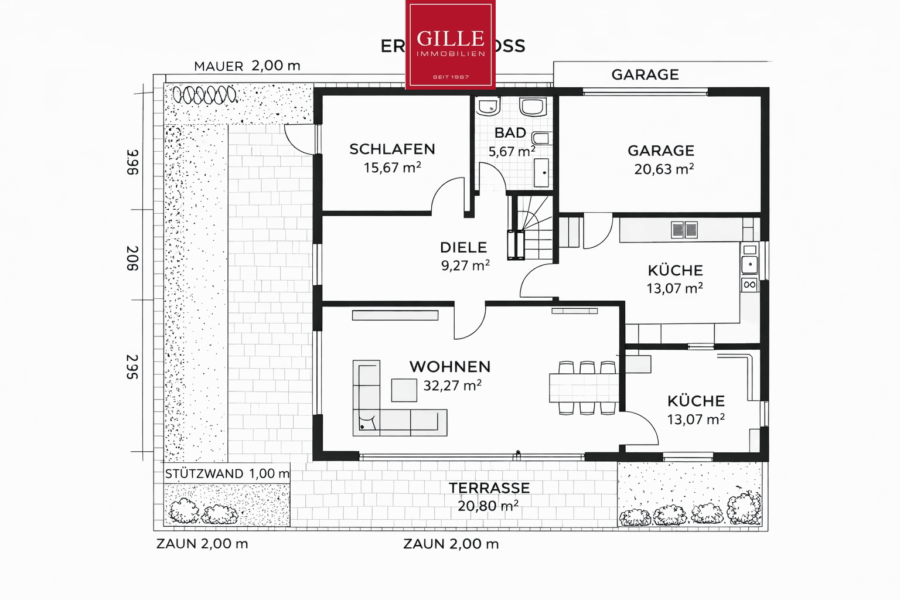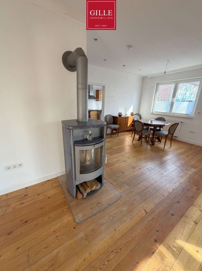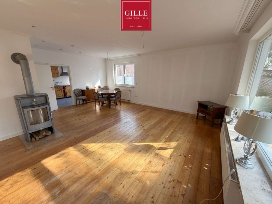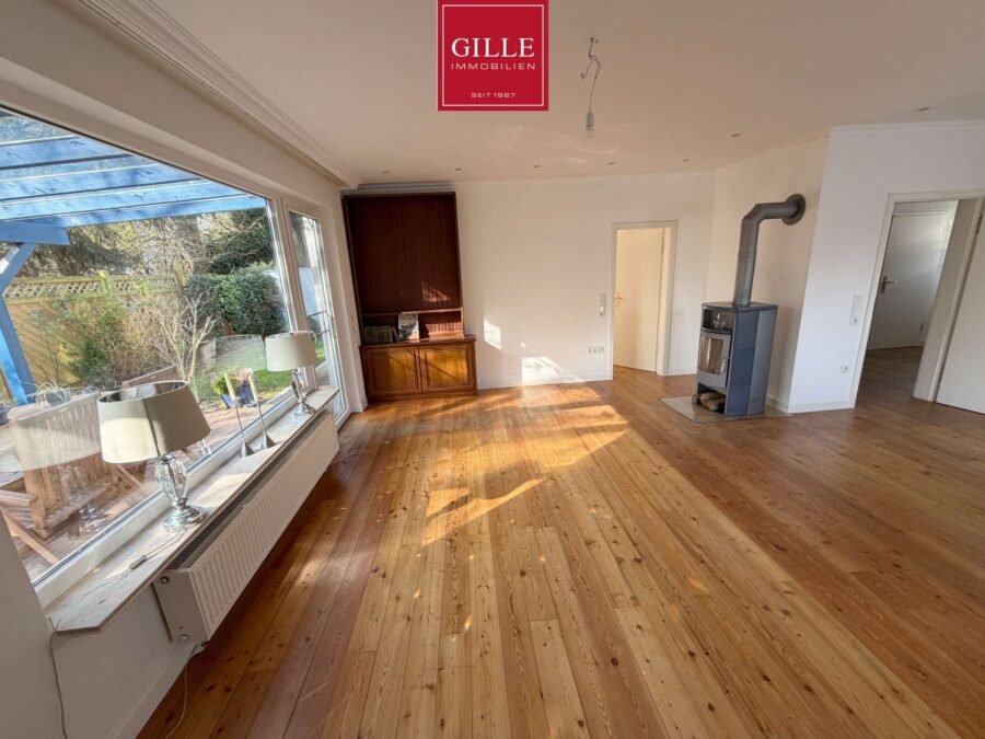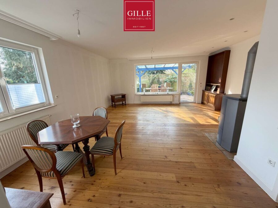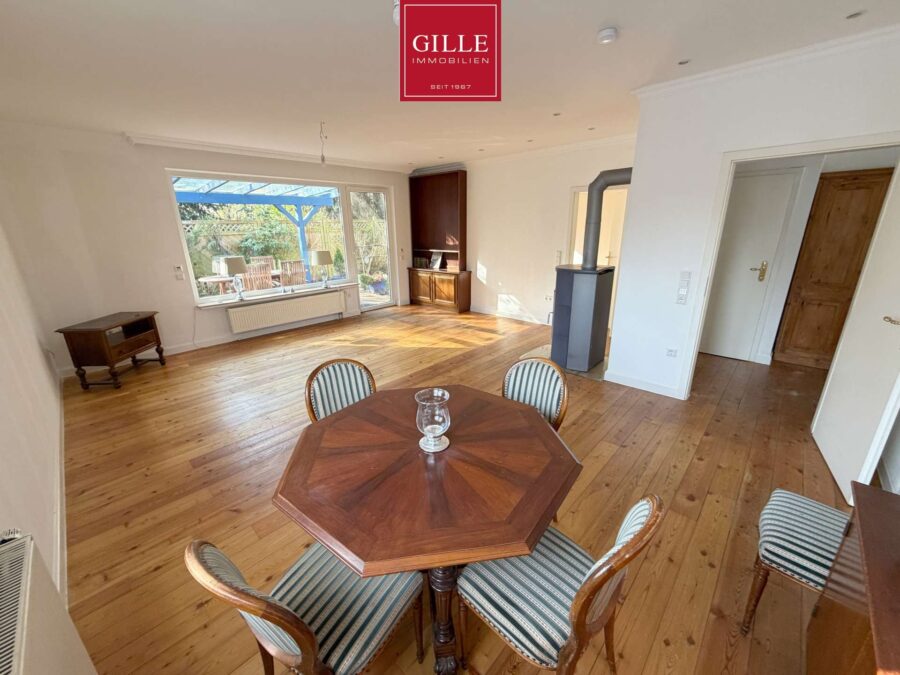 Im Erdgeschoss gelangen Sie über die zentrale Diele in alle Räume. Der großzügige Wohnbereich mit ca. 32 m² bildet den Mittelpunkt des Hauses und bietet direkten Zugang zur Terrasse. Ein vorhandener Kamin im Wohnbereich sorgt für zusätzliche Wärmequelle und schafft eine angenehme Wohnatmosphäre.