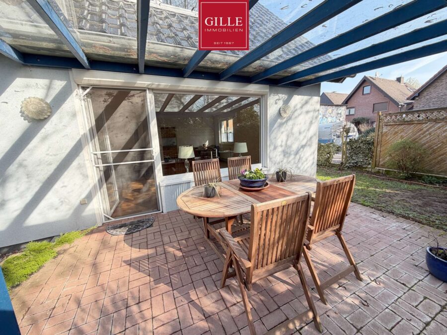 Gepflasterte Sitzfläche mit ausreichend Platz für Gartenmöbel