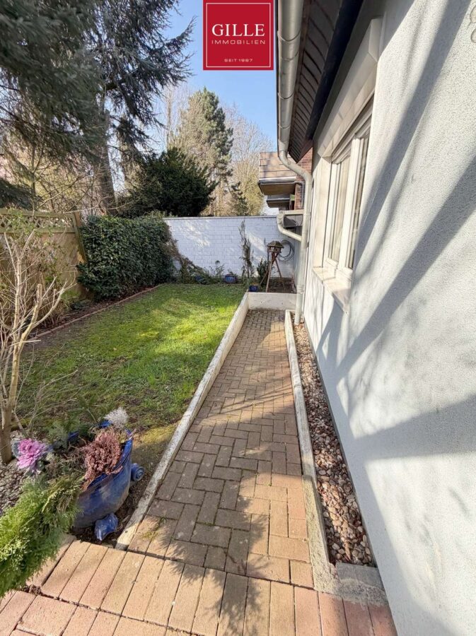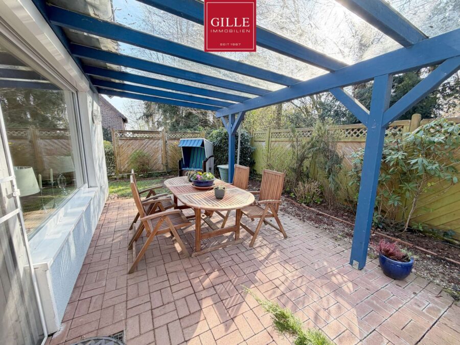 Der Außenbereich ist ideal für entspannte Stunden im Freien und bietet gleichzeitig pflegeleichte Strukturen.