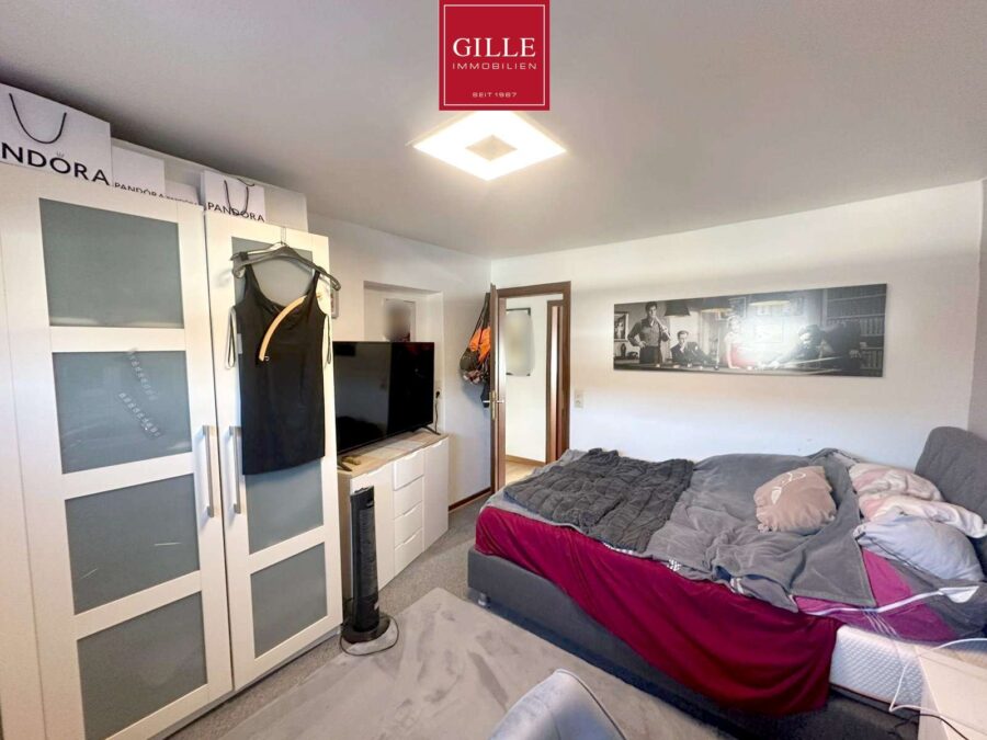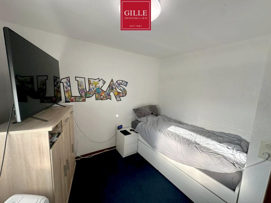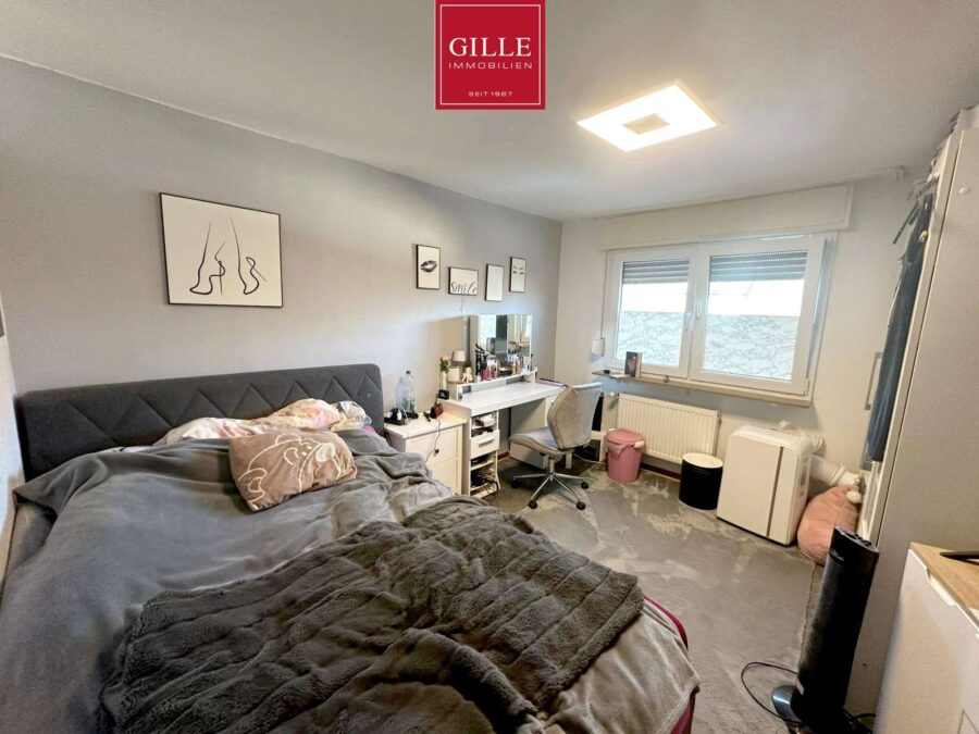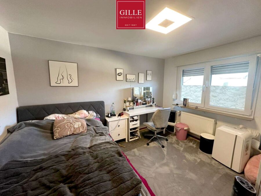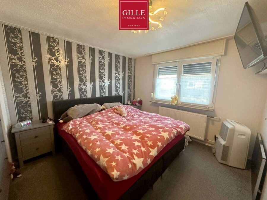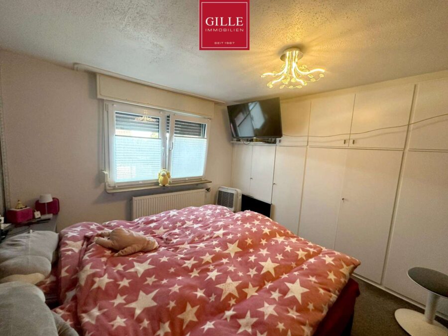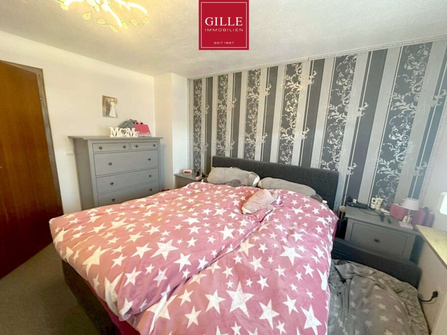 Das Elternschlafzimmer verfügt über einen großzügigen, weißen Einbauschrank, einen Teppichboden und ein Doppelflügelfenster inkl. manuell bedienbaren Außenrollläden. Das danebenliegende helle und toll geschnittene Kinderzimmer verfügt ebenfalls über ein Doppelflügelfenster inkl. manuell bedienbarer Außenrollläden und ist mit einem hellgrauen Teppichboden versehen.