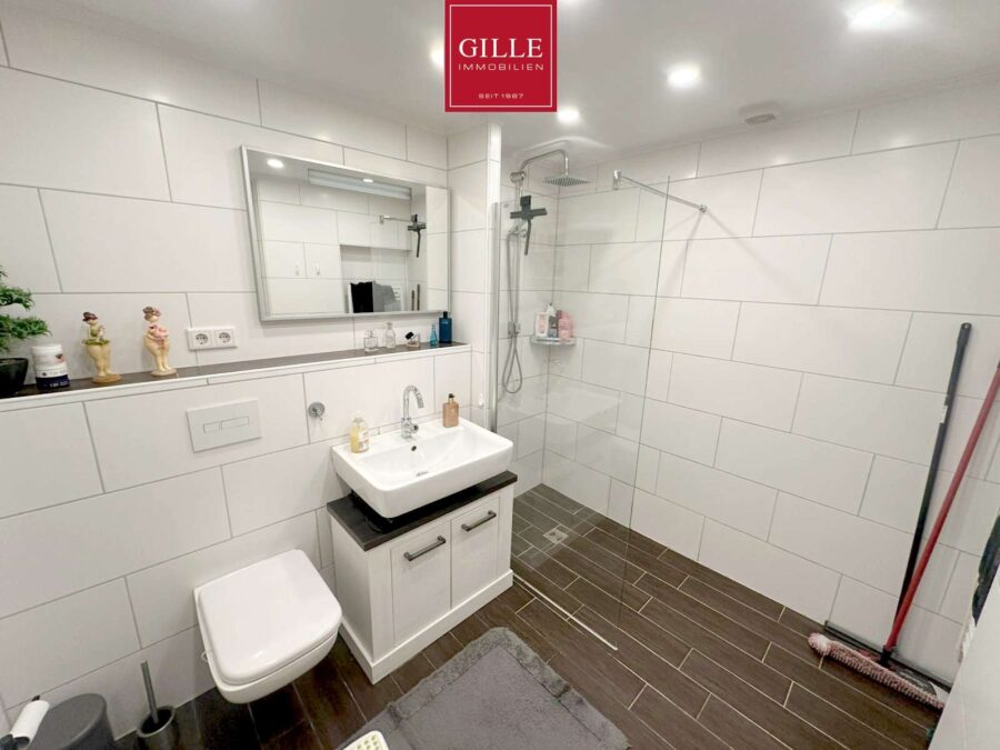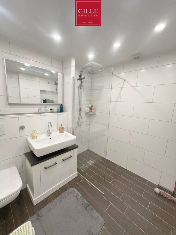 - Neuwertiges barrierefreies Duschbad im EG mit großzügiger Dusche inkl. Glasabtrennung, WC, Waschbecken, Spiegelschrank, Einbauschrank u. Einbauspots