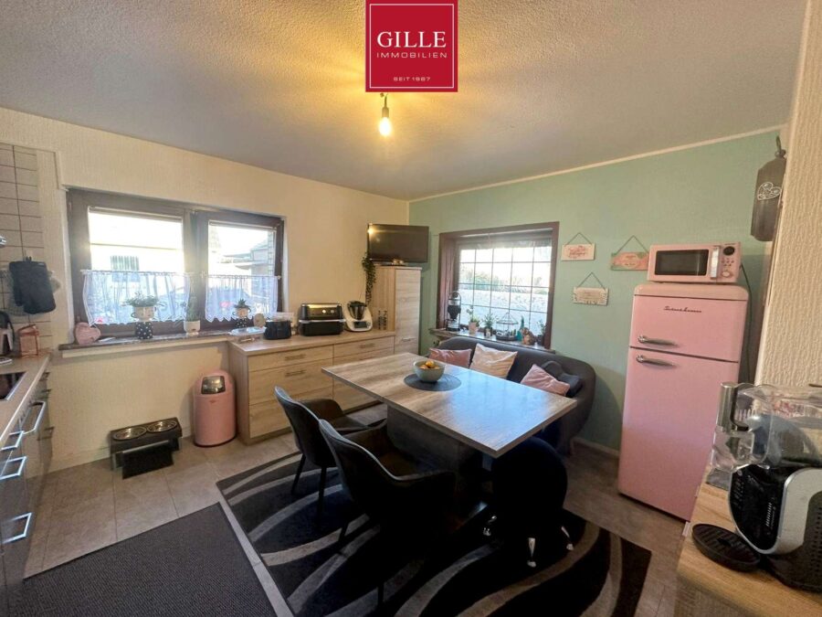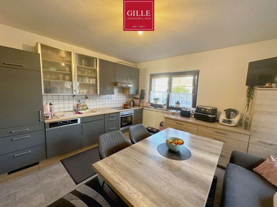 Die angrenzende großzügige Wohnküche verfügt über graue Bodenfliesen, einen hellen Fliesenspiegel und einen Dunstabzug nach draußen. Die 3 großen Fenster inkl. nachgerüsteten Außenrollladen spenden dem Raum viel Tageslicht. Die abgebildete Einbauküche ist im Kaufpreis nicht enthalten.