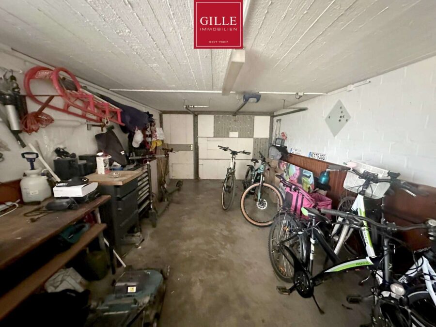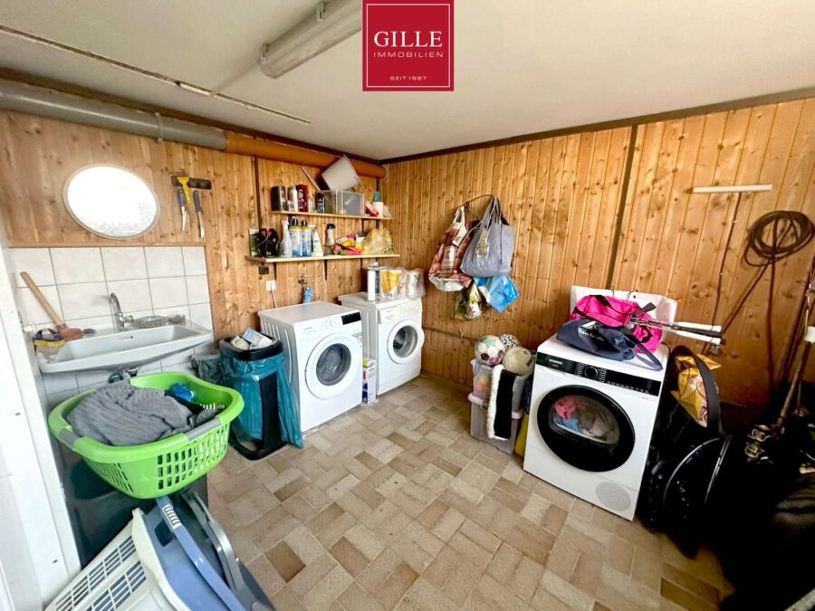 Die sehr groß konzipierte Garage verfügt über ein elektrisches Garagentor und eine separate Türe zur Garage. Sie bietet Ihnen Abstellfläche für einen PKW, diverse Gartengeräte und die Unterbringung einer Werkstatt ist möglich. Von der Garage aus erreichen Sie den gefliesten Wasch- und Trockenraum.
