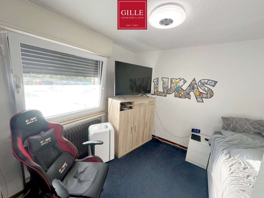 Das gegenüberliegende kleine Arbeits- oder Kinderzimmer ist mit Teppichboden und einem Fenster inkl. manuell bedienbarer Außenrollläden und einem tollen Blick in den eigenen Garten ausgestattet.