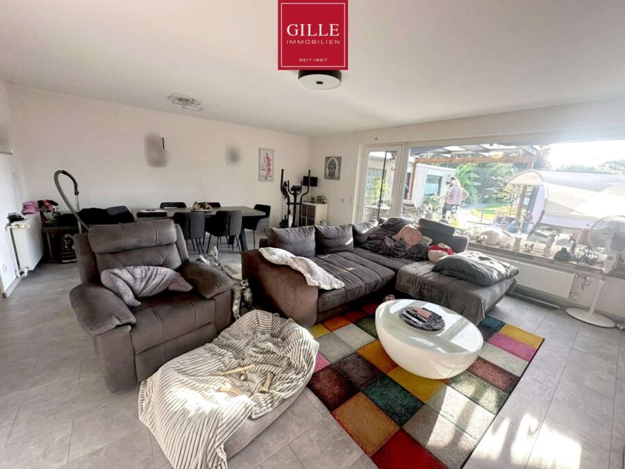 - großzügiger und heller Wohn-Essraum mit hellgrauen Bodenfliesen, großer Fensterfront inkl. Ausgangstüre zur Terrasse bzw. zum Garten