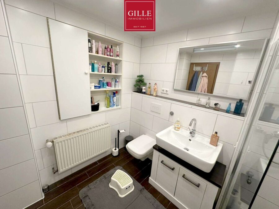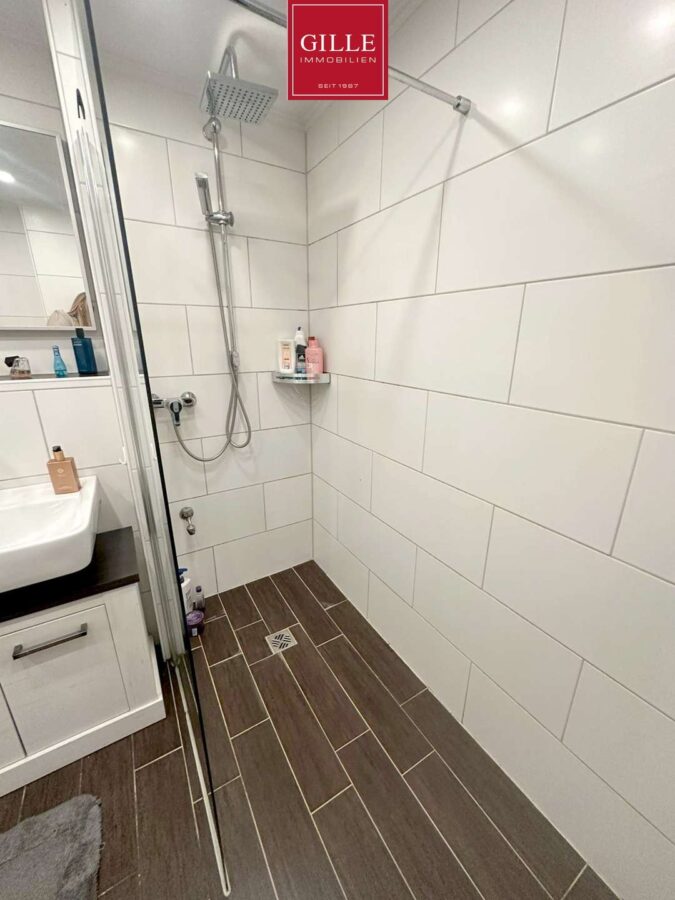 Das hochwertig ausgestattete und in ca. 2016 sanierte Duschbad wurde barrierefrei gestaltet und verfügt über eine großzügige bodentiefe Dusche inkl. Glasabtrennung, ein modernes Waschbecken, einen großen Spiegel, ein WC, eine geflieste Ablage, ein Handtuchheizkörper und Einbauspots. Für den Fußboden wurde eine braune Steinzeugfliese gewählt, diese bildet mit den weißen Sanitärgegenständen und den weißen Wandfliesen ein stimmiges Bild.