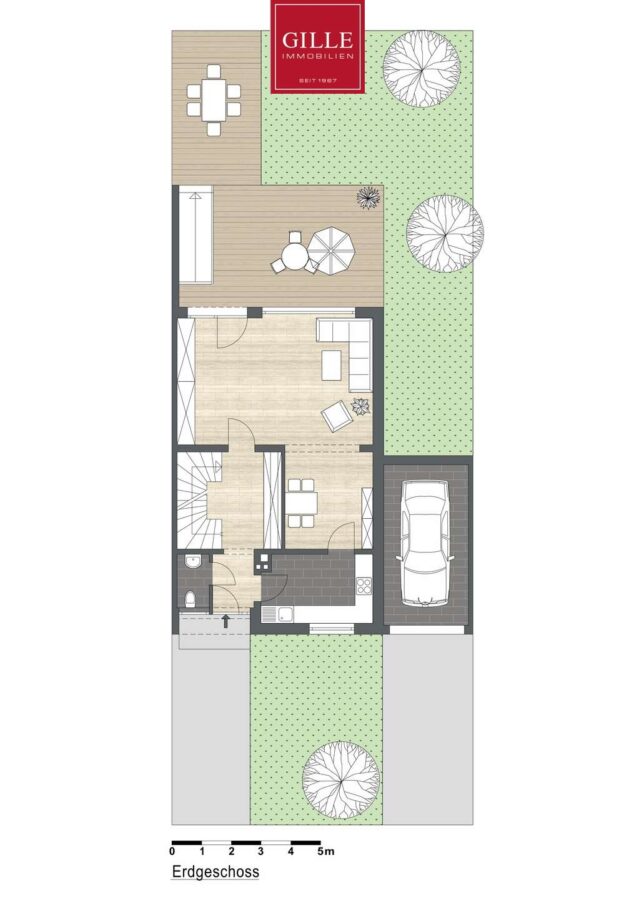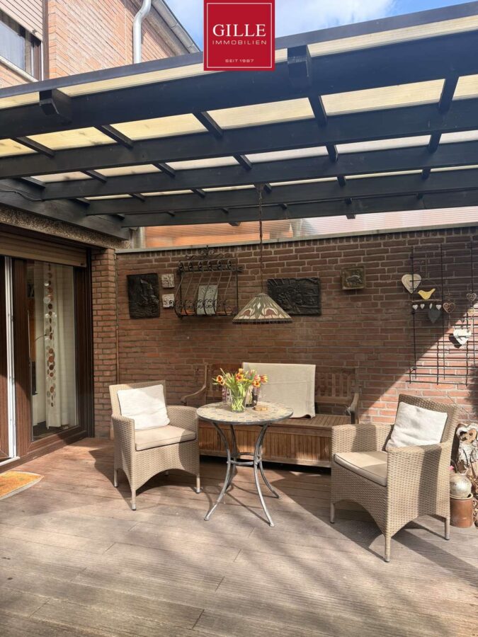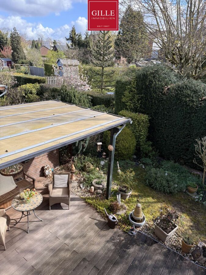 Dem Wohn-Esszimmer vorgelagert finden Sie eine sehr große Sonnenterrasse mit Holzdielenbelag aus Bankirai-Holz. Ein großer Teil der Terrasse wurde überdacht und bietet somit die Möglichkeit, auch bei schlechter Witterung den Garten zu genießen. Vom Garten aus haben Sie einen Zugang zur Garage.