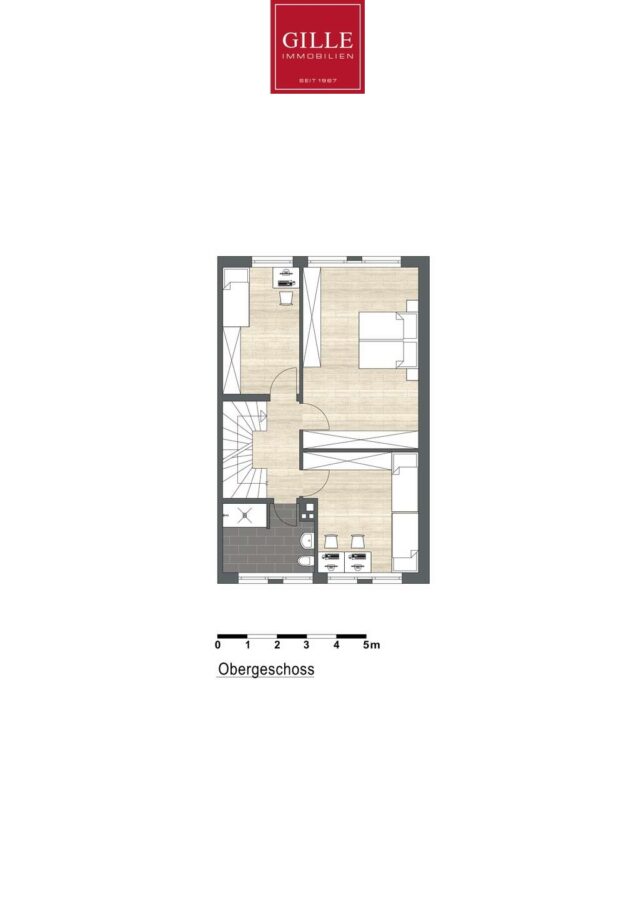 Im ersten Obergeschoss befinden sich drei Zimmer und ein Bad: