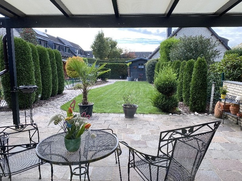 gepflegter Vorgarten; schöner Garten mit überdachter Terrasse, Markise und Gartenhaus;