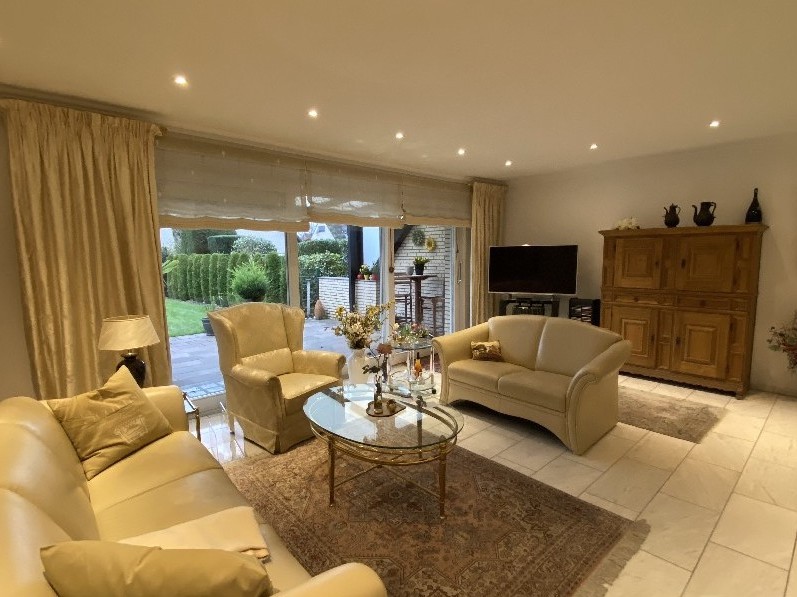 Das Wohnzimmer ist dem Garten zugewandt. Dank der großen Fenster(Schiebe)elemente ist es ein heller Raum mit viel Licht und Ausblick in den schönen Garten.