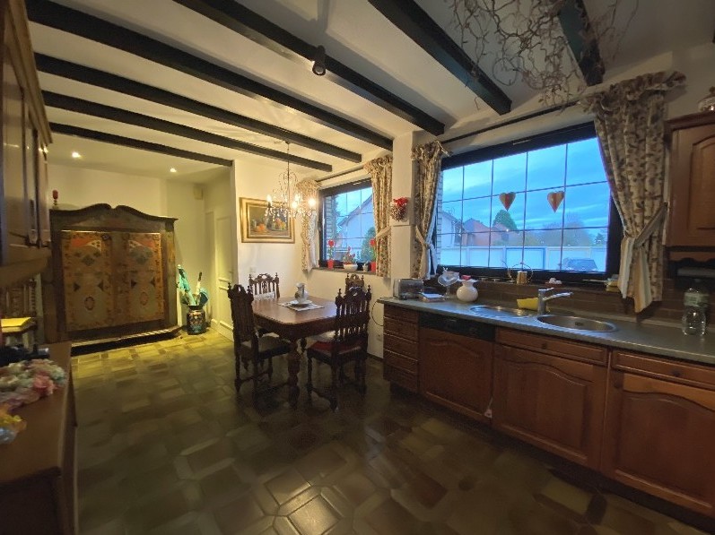 Die Küche ist zur Straßenseite hin ausgerichtet. Sie kann wirklich als Wohnküche genutzt werden, bietet sie doch viel Platz zum Kochen, Verstauen und einen schönen Essplatz.