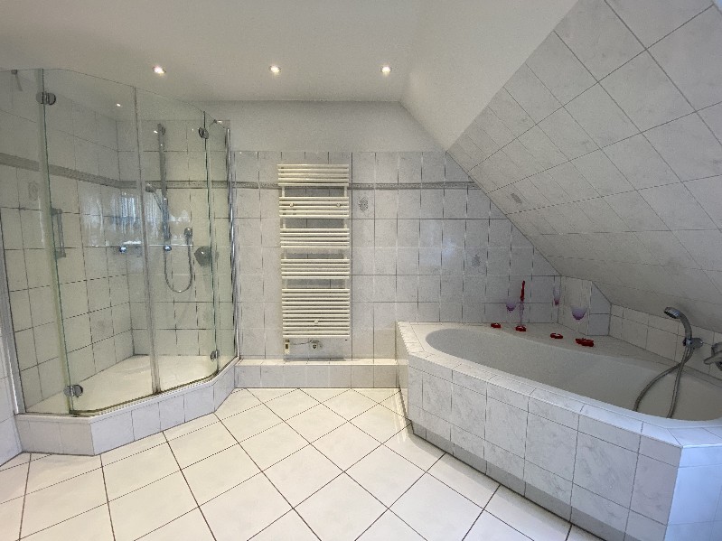 Das Dachgeschoss erreicht man über eine geflieste Treppe von der Diele aus. Oben angelangt, stehen Ihnen das großzügige Bad mit Wanne, Dusche und Fenster sowie ein separates WC zur Verfügung!