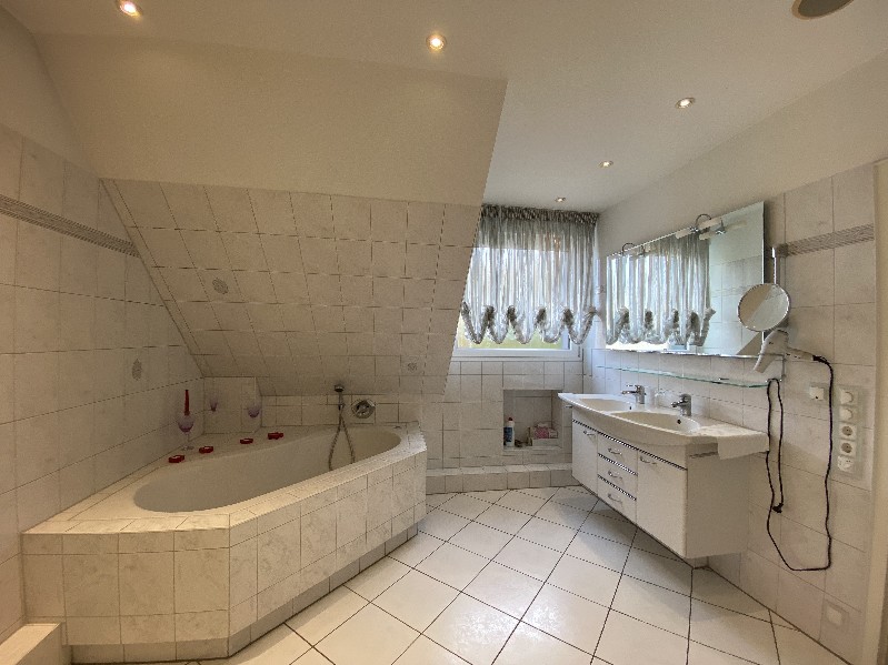 helles Bad mit Dusche, Wanne und Fenster im OG; separates modernes WC im OG; Ankleidezimmer im OG;