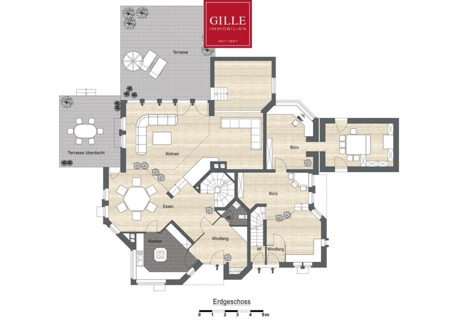 Seitlich am Haus, zur Ostseite hin, finden Sie eine weitere, mit Glas überdachte Terrasse mit zusätzlichem Außenessplatz. Von beiden Terrassenflächen aus haben Sie neben einem schönen Grünblick in den eigenen Garten auch Zugang zur Gartenfläche, zum Koi-Teich und separaten Grillpavillon.