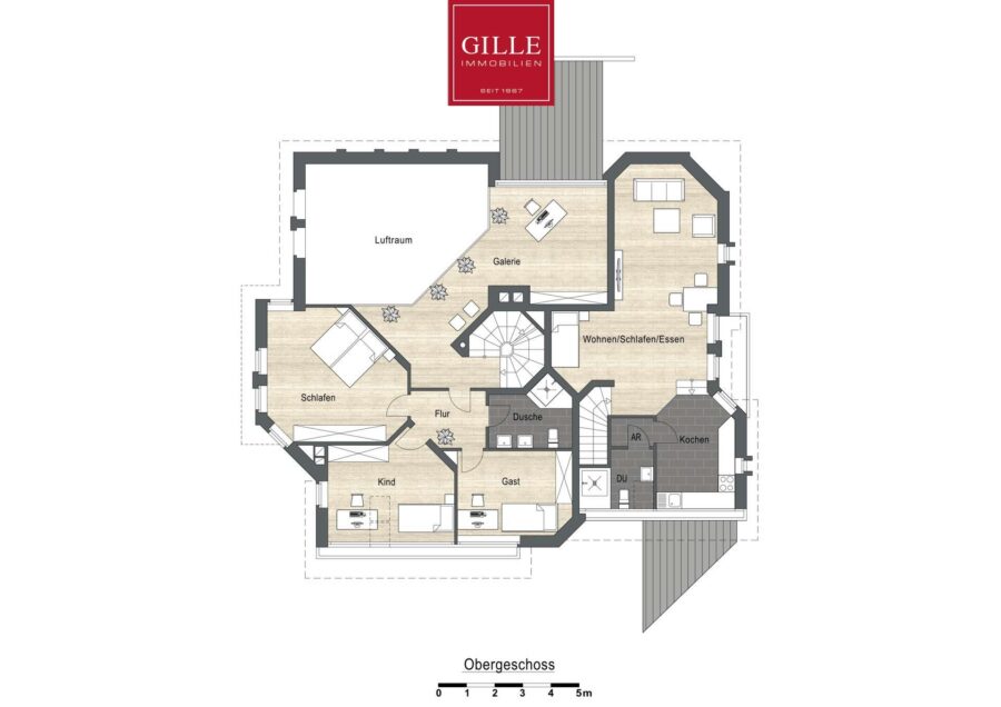 In der großzügigen und sehr hohen Dachspitze befindet sich derzeit ein separater Elternschlafbereich mit großzügigem Ankleideflur, mit hochwertigen Einbauschränken, einem freundlichen Elternschlafzimmer mit Einbauschränken und Betteinbauten vom Schreiner. Damit in den heißen Sommertagen das Schlafen möglich ist, haben die Eigentümer diesen Bereich mit einer Klimaanlage ausgestattet.