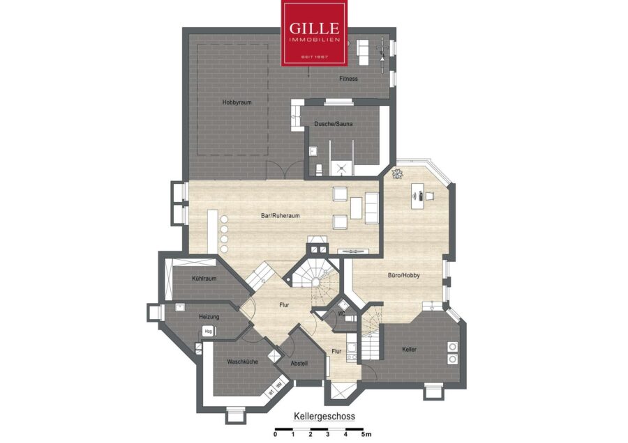 Zusätzlich finden Sie hier eine klassische Kellerbar mit Theke, einen offenen Kamin mit Sitzbereich und einen mit Glas abgetrennten Sport- bzw. Hobbyraum. Hier wurde über dem ehemaligen Schwimmbecken eine Fitnessebene eingerichtet, die auch über eine Großbildleinwand verfügt und somit perfekt als privates Heimkino genutzt werden kann. Die Sauna bietet bis zu 4 Personen ausreichend Platz und verfügt neben einer gemauerten Großdusche noch über einen vorgelagerten Ruheraum und ein WC. Unmittelbar neben diesem Freizeitbereich liegt die weitere Bürofläche, die ebenfalls mit der Hauptwohnung verbunden ist. Dieser Bürobereich ist zusätzlich über einen eigenen Außenzugang erreichbar und bei Bedarf komplett autark nutzbar.