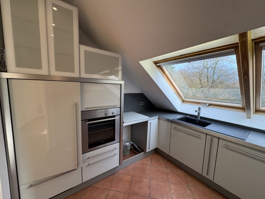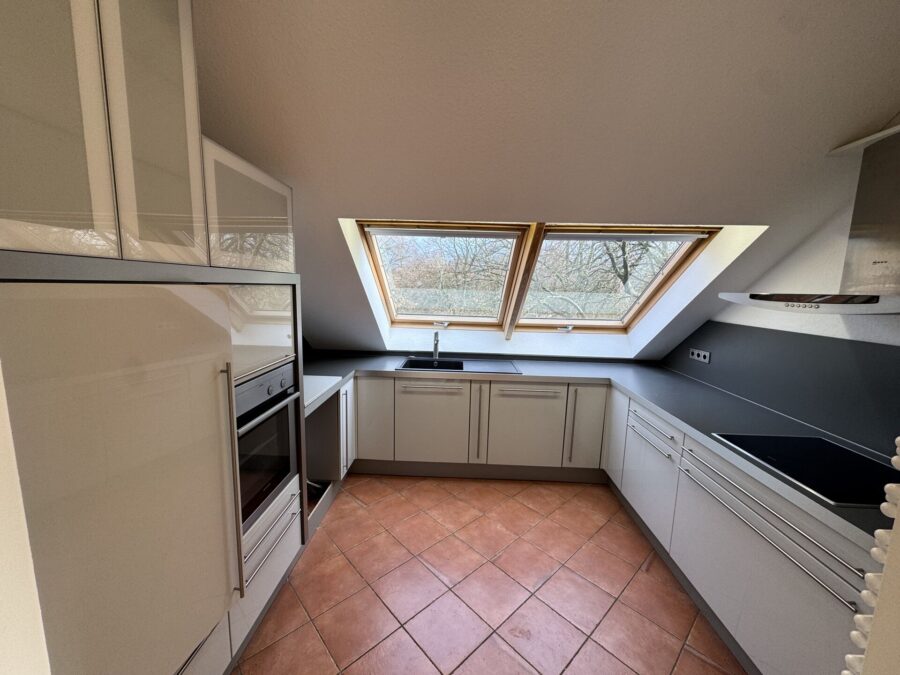 Die Küche ist separat angeordnet und über eine Milchglas-Schiebetür vom Essbereich getrennt. Dadurch bleibt sie optisch angebunden, während Gerüche und Geräusche diskret abgeschirmt werden.
