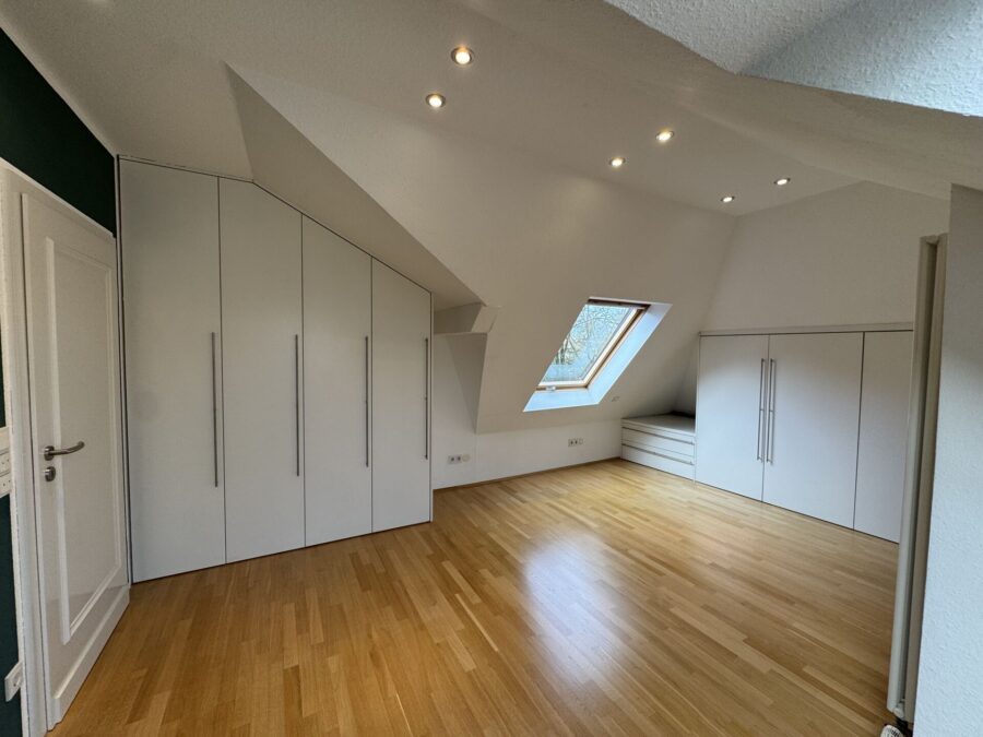 Das Hauptschlafzimmer verfügt über praktische Einbauschränke sowie ein direkt angeschlossenes Bad en Suite mit Badewanne und Dusche. Ein weiteres Zimmer eignet sich flexibel als Kinder-, Gäste- oder Arbeitszimmer.