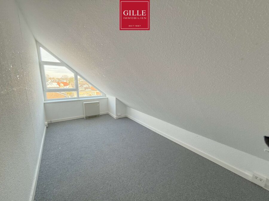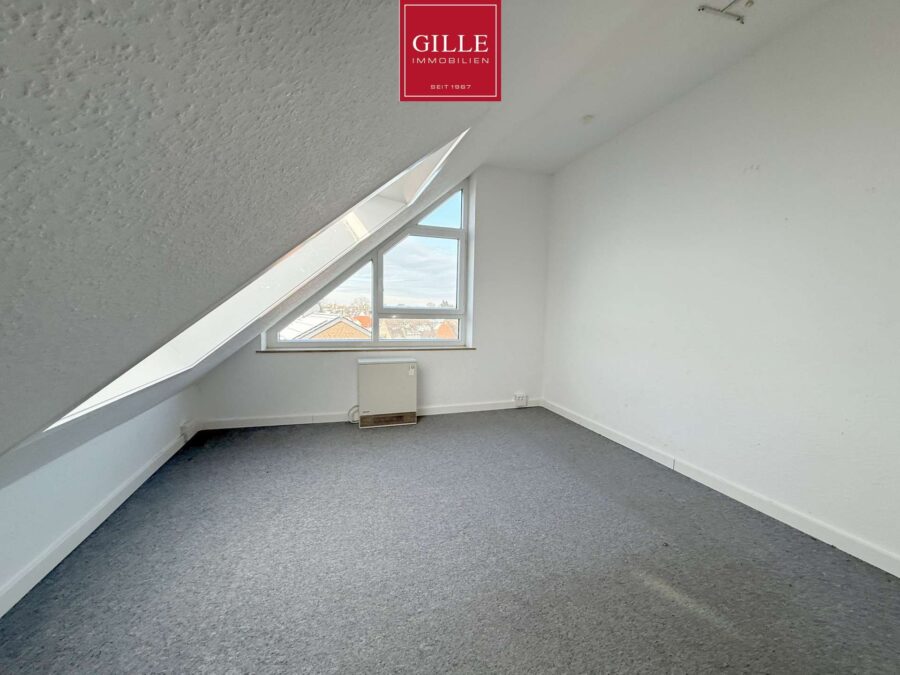 Das Schlafzimmer ist mit einem Dachflächenfenster sowie einem Giebelfenster versehen und bietet Ihnen eine kleine Nische, welche super als Kleiderschrank genutzt werden kann. Das angrenzende Arbeits- oder Gästezimmer ist wie alle weiteren Wohn- und Schlafräume im Dachgeschoss mit einem grauen Teppichboden ausgestattet.