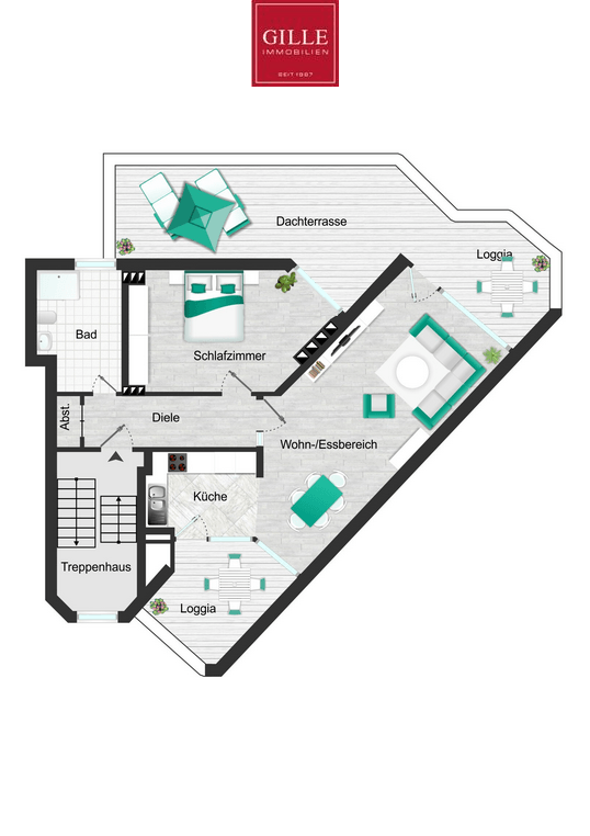 Wir möchten Sie darauf aufmerksam machen, dass die Flächen der Loggia und der Dachterrasse zu 50% mit in die Wohnflächenberechnung einbezogen wurden.