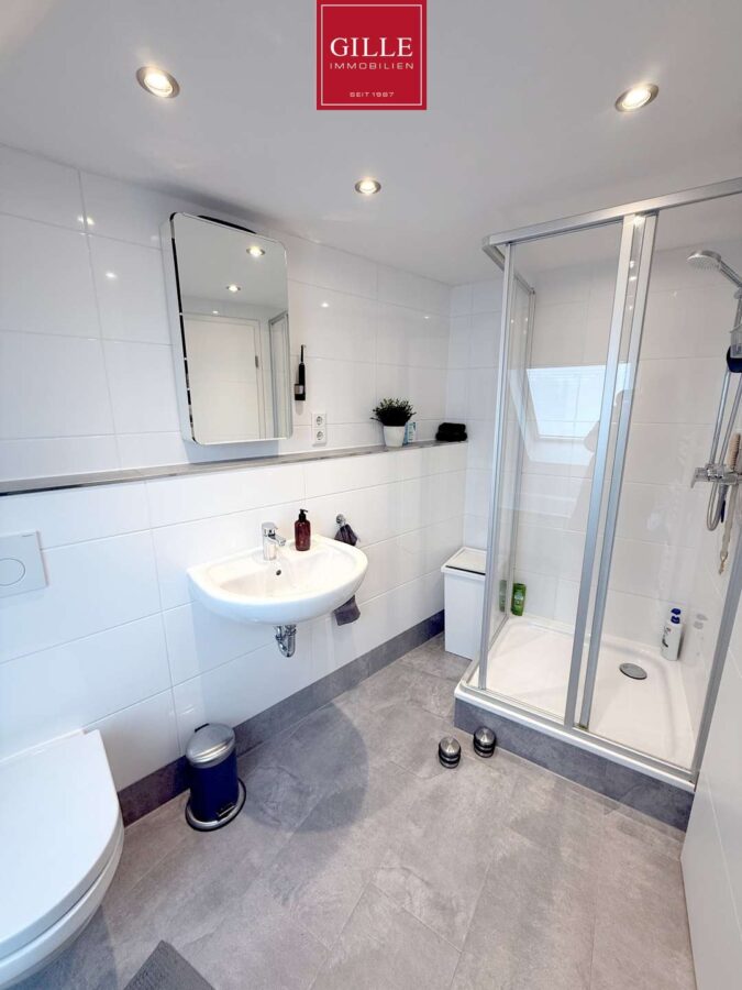 Das moderne und hochwertige Badezimmer ist mit einer Dusche inkl. Glasduschabtrennung, einer Badewanne, einem Waschbecken, einem WC, einem Dachflächenfenster und Einbauspots ausgestattet. Alle Sanitärgegenstände sind in weiß gehalten und bilden mit den großformatigen weißen Wandfliesen sowie den großformatigen grauen Bodenfliesen ein stimmiges Bild.