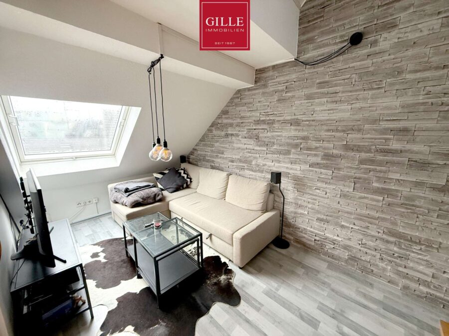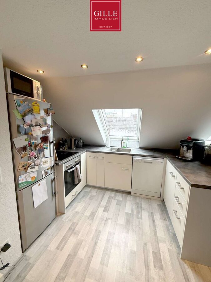 Der lichtdurchflutete und gemütliche Wohn- und Essbereich ist mit 3 Dachflächenfenstern, einem hellen Vinylboden, einer modernen grauen Steinwand und Einbauspots versehen. Die Einbauküche inkl. der Elektrogeräte kann von dem Vormieter gegen eine Abstandszahlung übernommen werden.