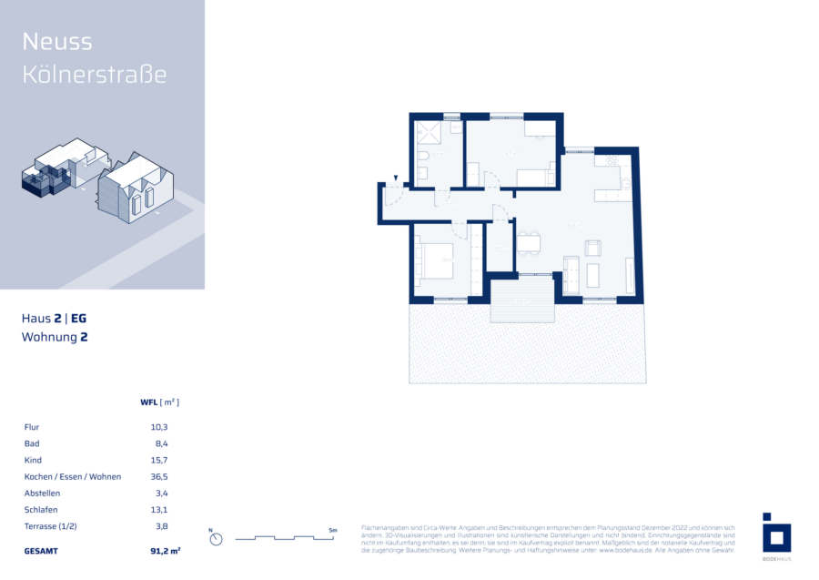 Die 3-Zimmer-Erdgeschosswohnung im Neubauprojekt an der Kölner Straße 246 in Neuss bietet auf ca. 91,2 m² Wohnfläche ein modernes und komfortables Zuhause. Das Herzstück ist der offen gestaltete Wohn- und Essbereich mit integrierter Küche, der sich über ca. 36,5 m² erstreckt und Raum für gemütliche Stunden sowie geselliges Beisammensein schafft.