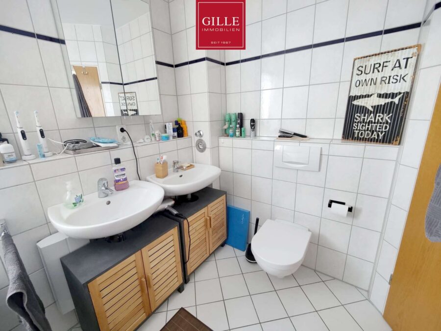 - Tageslichtbad mit Badewanne, Dusche u. neuwertiger Duschabtrennung, 2 Waschbecken, WC u. Fenster