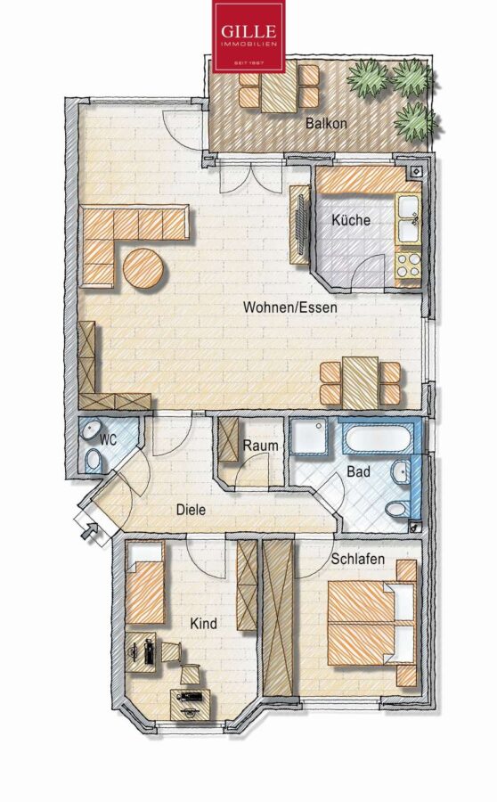 Die geräumige und gut aufgeteilte 3-Zimmerwohnung verfügt über einen hellen und großzügigen Eingangsbereich, welcher Ihnen mit Ausnahme der Küche Zugang zu sämtlichen Räumen bietet, ein Schlafzimmer, ein Tageslichtbadezimmer, ein Kinderzimmer, ein Gäste-WC, ein Abstellraum sowie ein geräumiges Wohn- und Esszimmer mit Zugang zur Küche und zum großen Balkon.