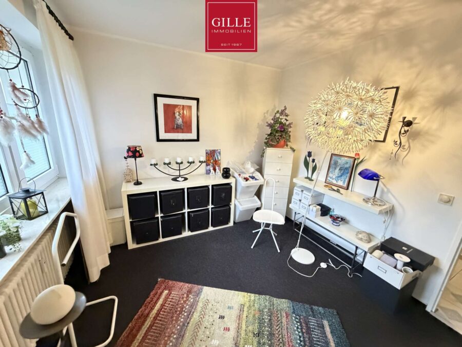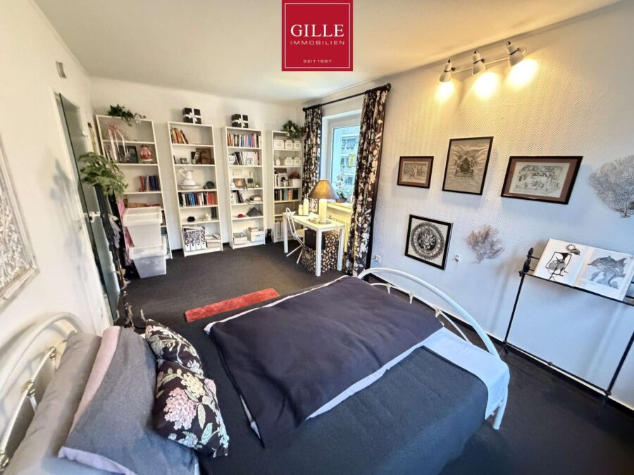 Ebenfalls von der Diele aus gelangt man in das große Kinder- oder Arbeitszimmer mit Teppichboden und großem Fenster. Dieses Zimmer ist sehr gut zu möblieren. Auch das sehr große Elternschlafzimmer ist gut zu möblieren und verfügt über zwei große Fenster. Im Badezimmer befindet sich eine Badewanne, ein WC und ein Waschbecken.